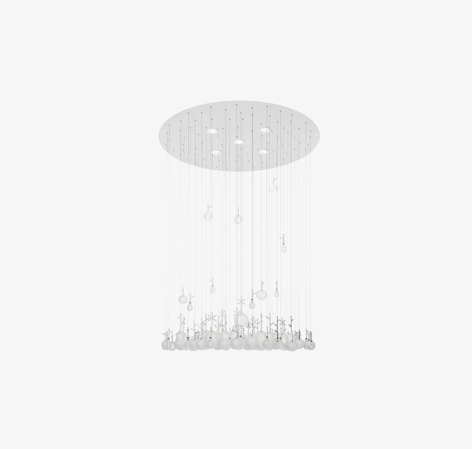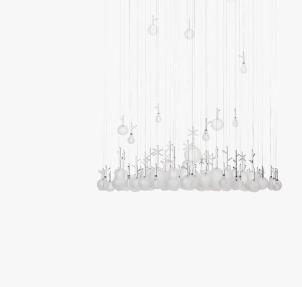 Czech Bohemian glass shapes the work, sandblasted to soften glare and lend a velvety depth. The finish tempers reflections and brings out the contours of each blown form. As with all handmade glass, subtle bubbles and tone shifts may appear; they are part of the craft and the charm. The frame is lacquered in glossy white, RAL 9010, a clean counterpoint that lifts the glass without competing with it.