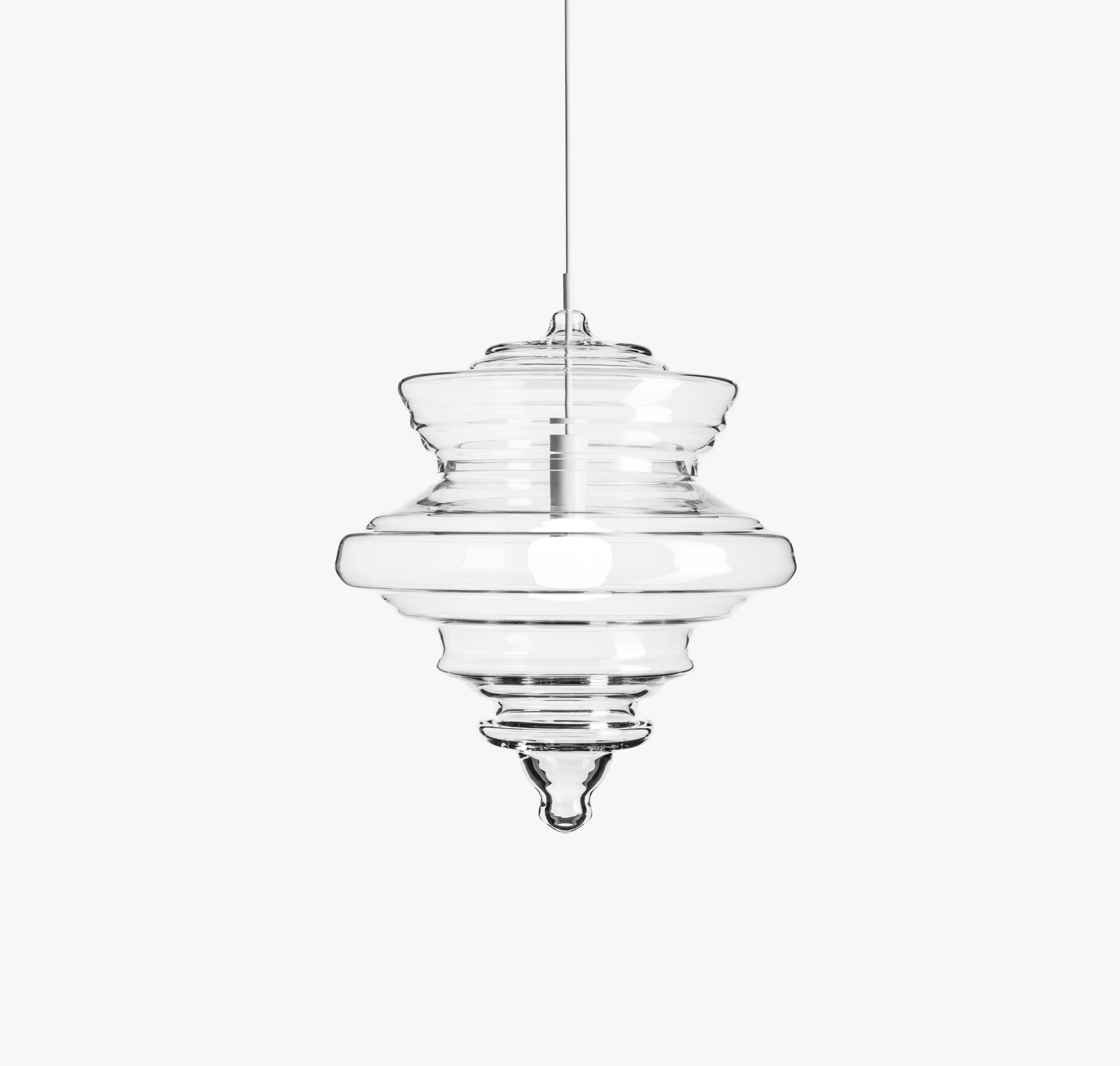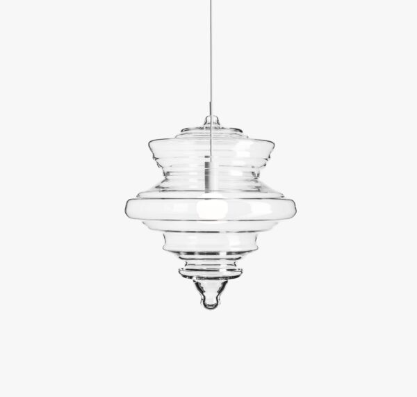 Formed from substantial clear glass, the piece is made using large wooden molds that push traditional glassmaking to its practical limit. That scale shows. The pendant measures approximately 21.7 inches in diameter and 23.6 inches in height, with a weight close to 22 pounds. A matte white lacquered frame (RAL 9010) supports the body without visual noise, letting the glass remain the focus. As with all handmade glass, subtle bubbles or tone variations may appear—small marks of the process that add character rather than distraction.