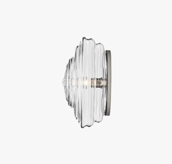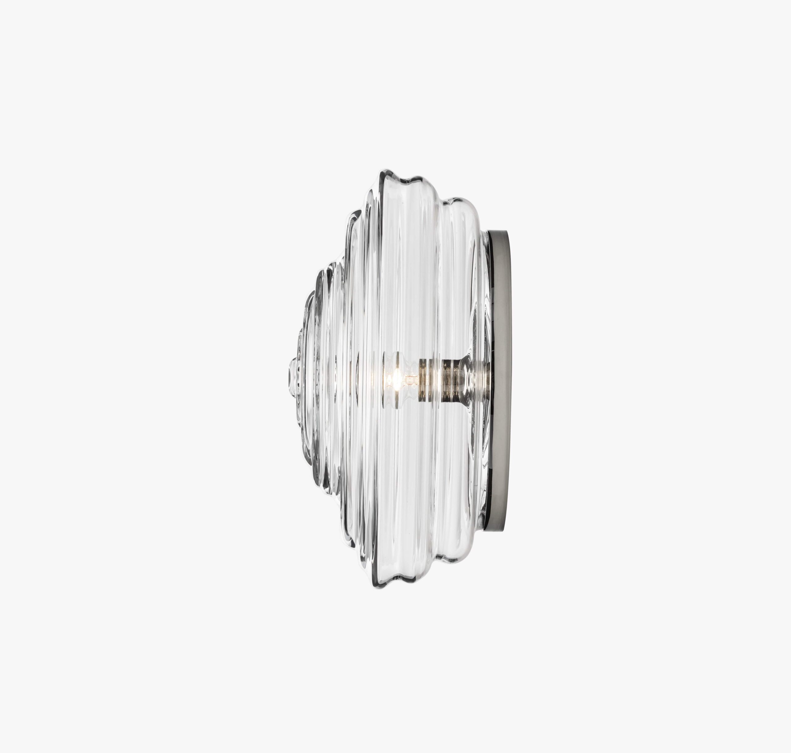 Proportions are generous yet balanced: approximately 17.4 inches in diameter, 9.2 inches high, and 9.4 inches wide. It reads as a statement when used solo, and quietly aligns in pairs. In clear glass with a glossy nickel-plated frame, it keeps the wall open and bright, not busy. This is Lasvit at its most restrained—recognizable, but not loud.