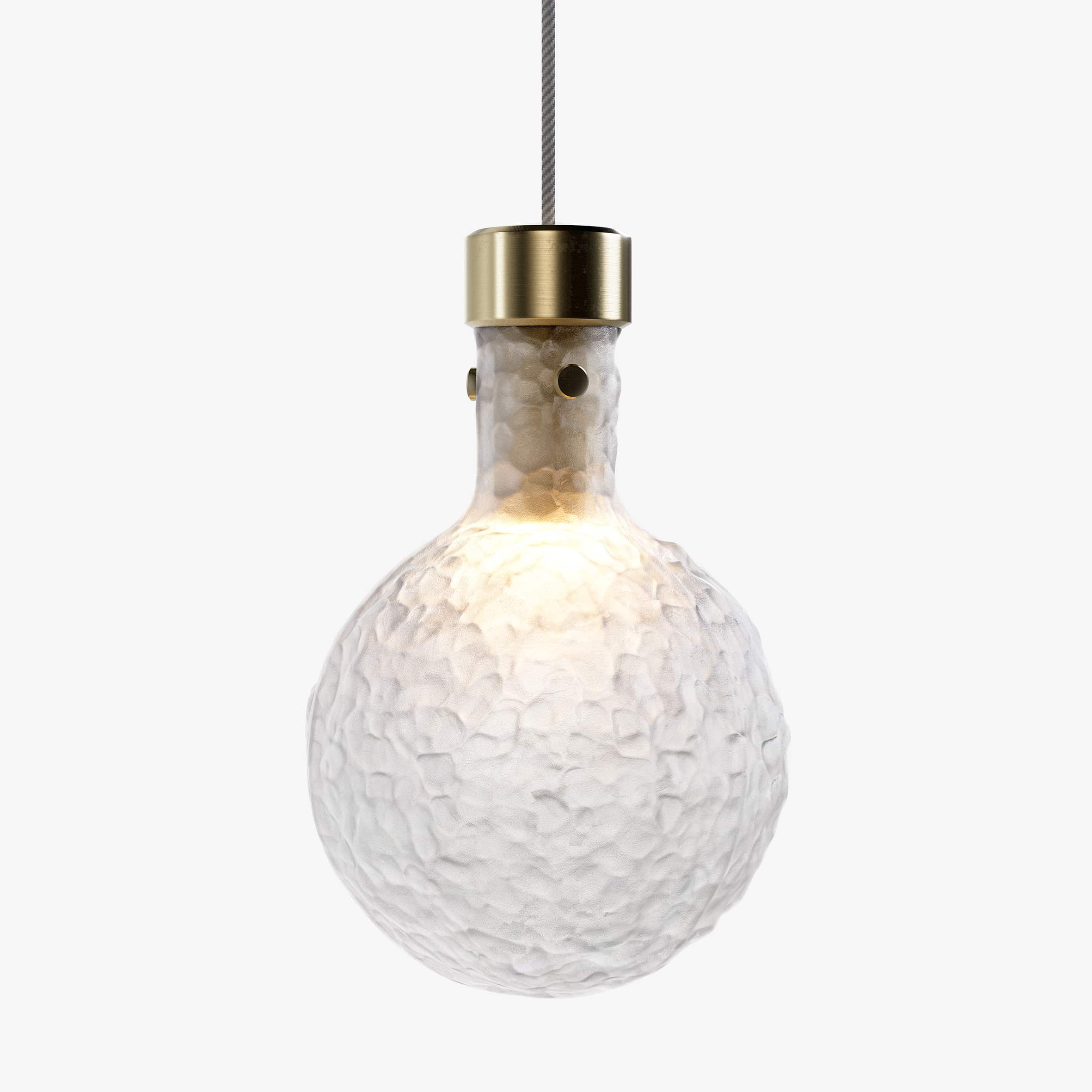 Hand‑blown glass gives the piece its organic character, while the sandblasted finish lends a refined, velvety texture. A brushed brass frame grounds the lamp with warm, understated metalwork. Nothing flashy, just honest materials chosen for how they age and how they feel to the touch.