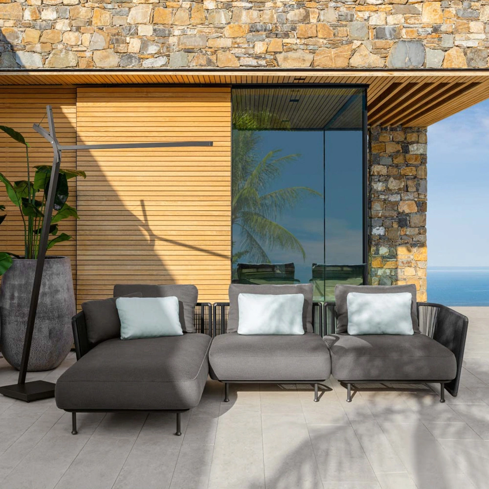 A slender aluminum structure anchors the sofa, giving it strength without excess weight. The frame supports the form with a steady, unobtrusive presence. Around it, synthetic rope defines the backrest and armrests, adding a tactile note that reads natural yet performs consistently outdoors.