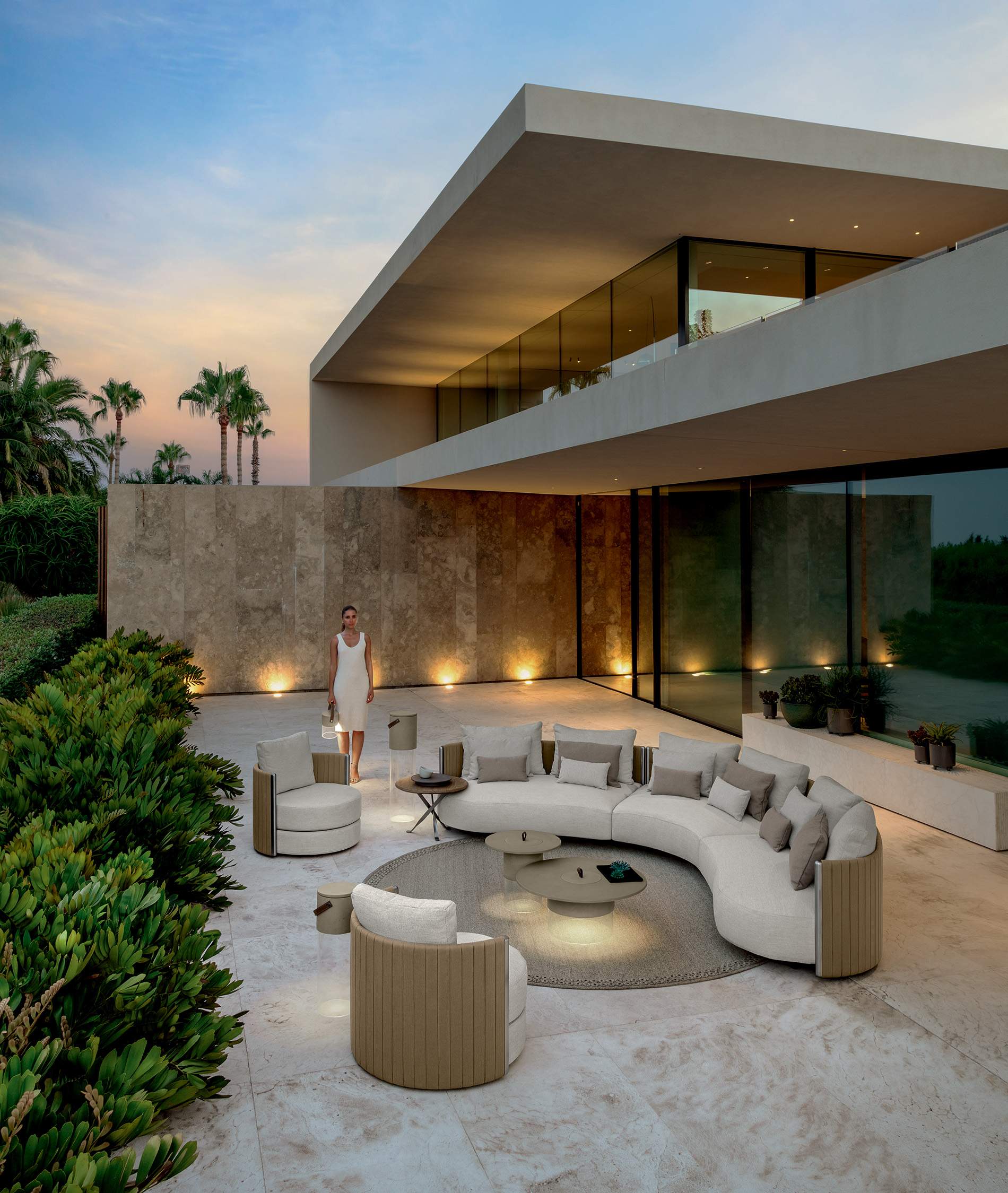 Finishes keep the aesthetic versatile, with Inox tones that include ivory, dark green, plain mud, and castle white. Upholstery arrives in a curated selection of fabrics designed for outdoor use, with weather-tight covers that can be refreshed when the mood or setting changes. No fuss, just considered choices.