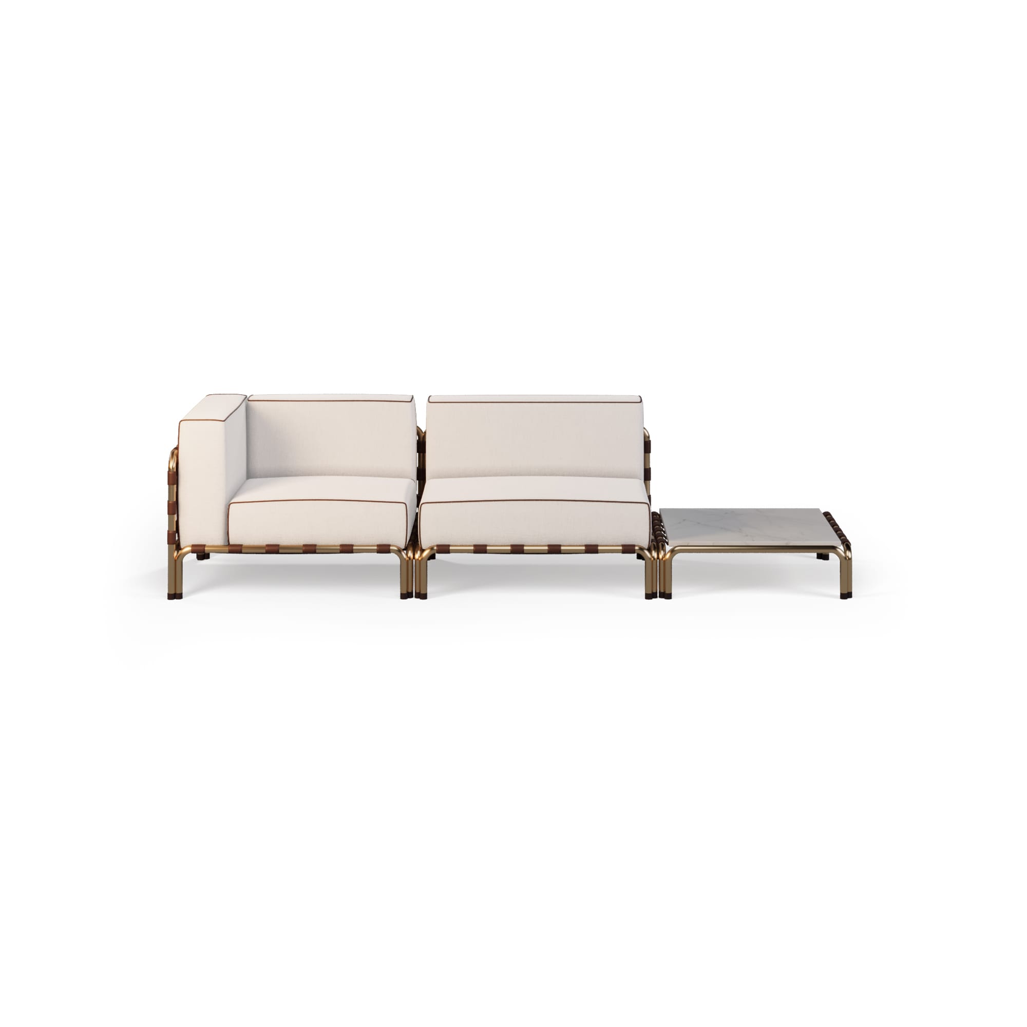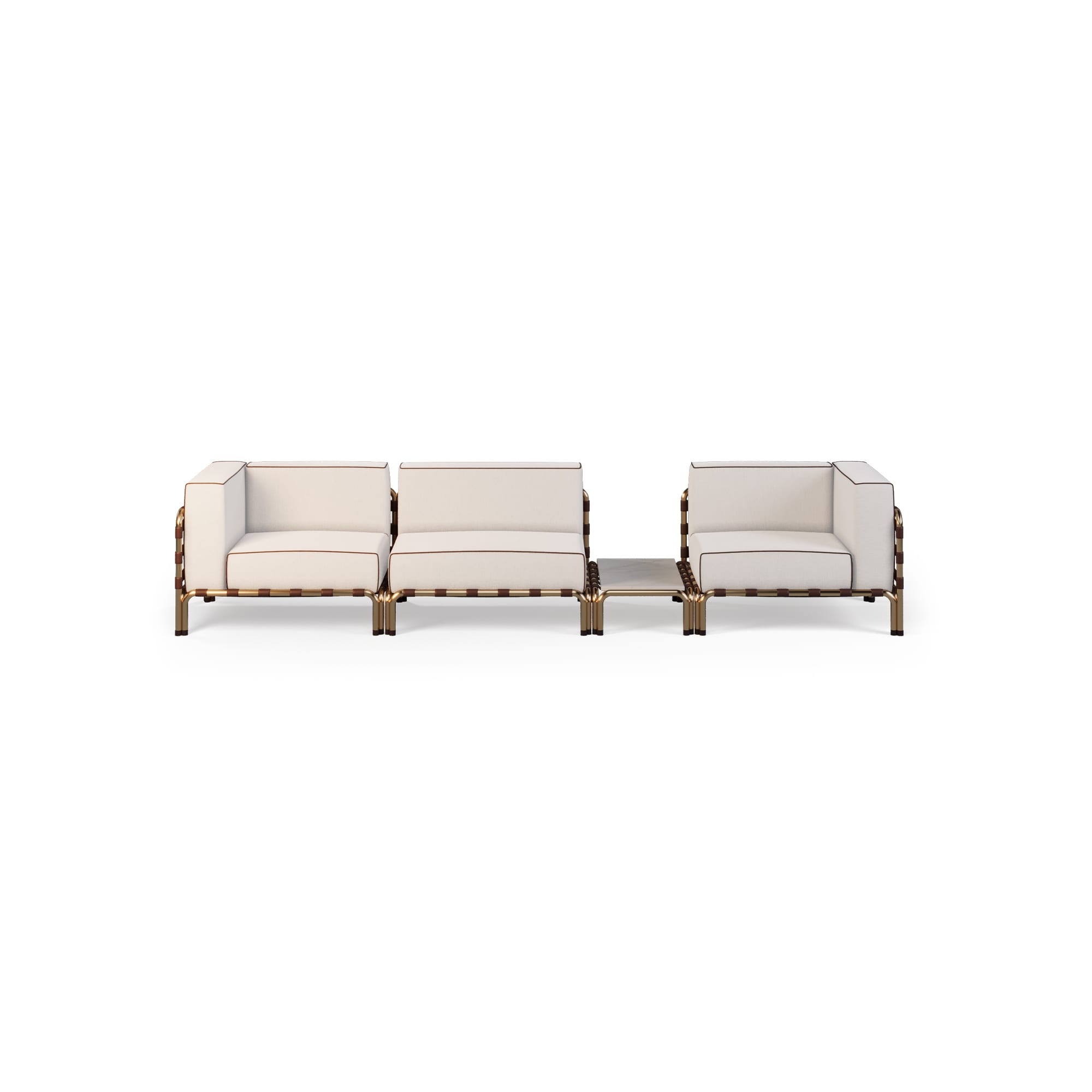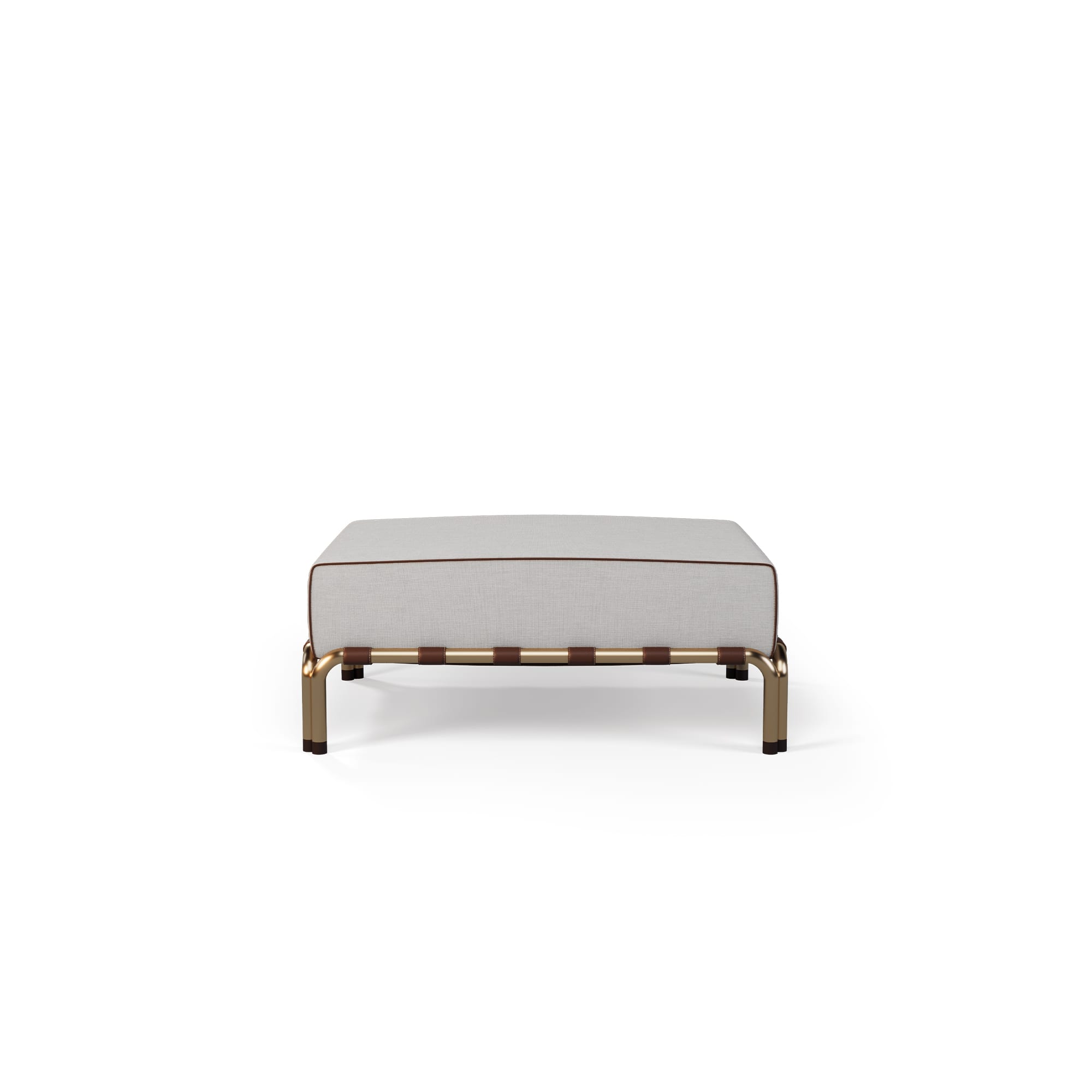 Materials are chosen for outdoor life, not just outdoor looks. Upholstery is an acrylic fabric that’s suited to open-air settings, while the straps are made in Outdoor Leather for a tailored finish and a bit of structure. The main frame uses lacquered stainless steel, with plated stainless steel details that add a crisp, precise edge without stealing attention.