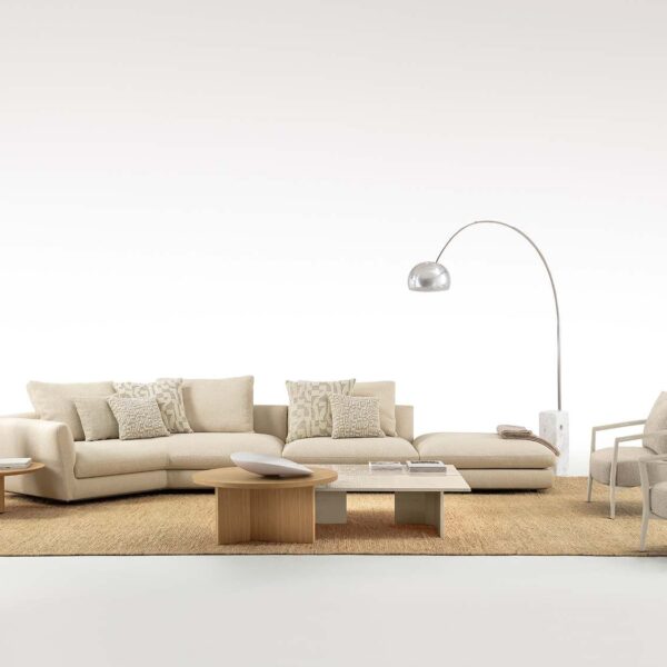 Modularity is core to how Miles works. End modules, corner pieces, left and right configurations — they all connect to form compositions that suit the room rather than forcing the room to suit them. A compact L-shape for a city apartment. A sprawling arrangement for a larger living area. The system adapts without losing its visual coherence. Every piece shares the same low profile and cushion language, so the layout always reads as one unified sofa.
