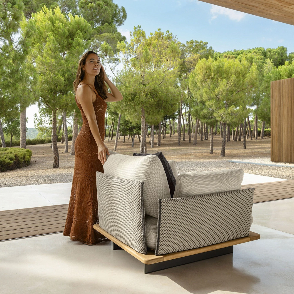 The base combines natural teak with Accoya, bringing together beauty and outdoor know‑how. The wood surfaces read warm and tactile, while the structure feels steady underfoot. No fuss, no noise—just honest materials chosen to perform outside and age with character. The palette revolves around natural teak complemented by textiles in cordonetto beige, tartan blue, or dark grey with beige accents, giving options that stay refined rather than loud.