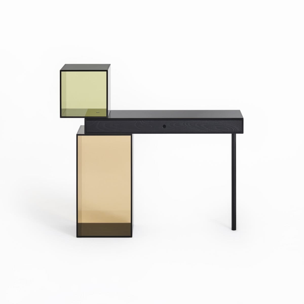 Ratio is a compact desk by Piero Lissoni, built from a sequence of smoked glass “boxes” that overlap and cantilever with a precise, architectural feel. The geometry is clean, but it doesn’t read cold. Angled joints and sharp edges give it definition, while the open compartments keep it visually light.