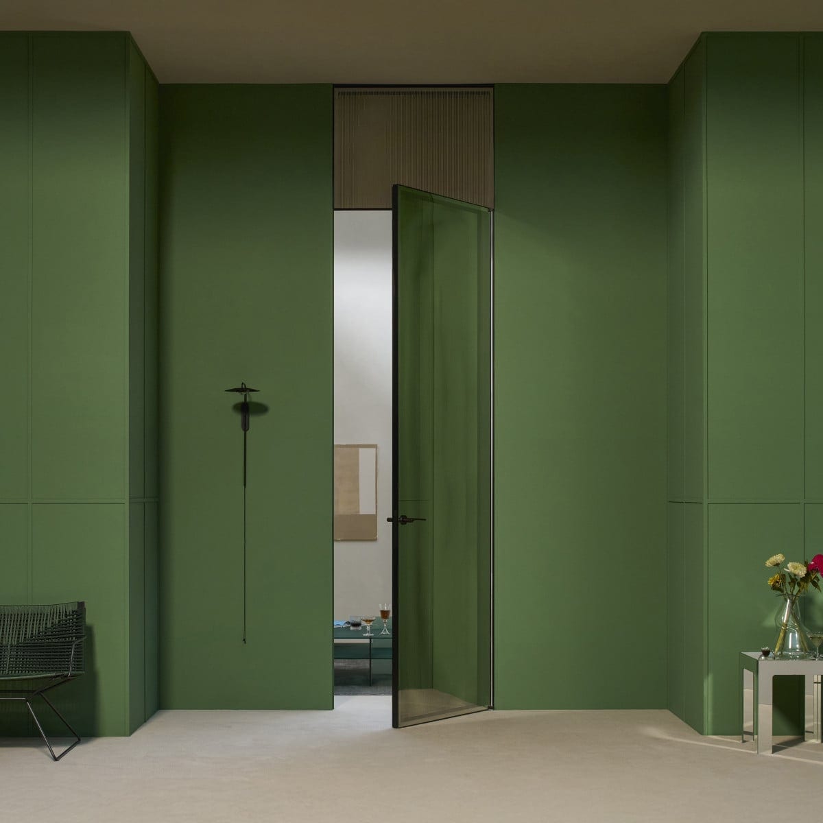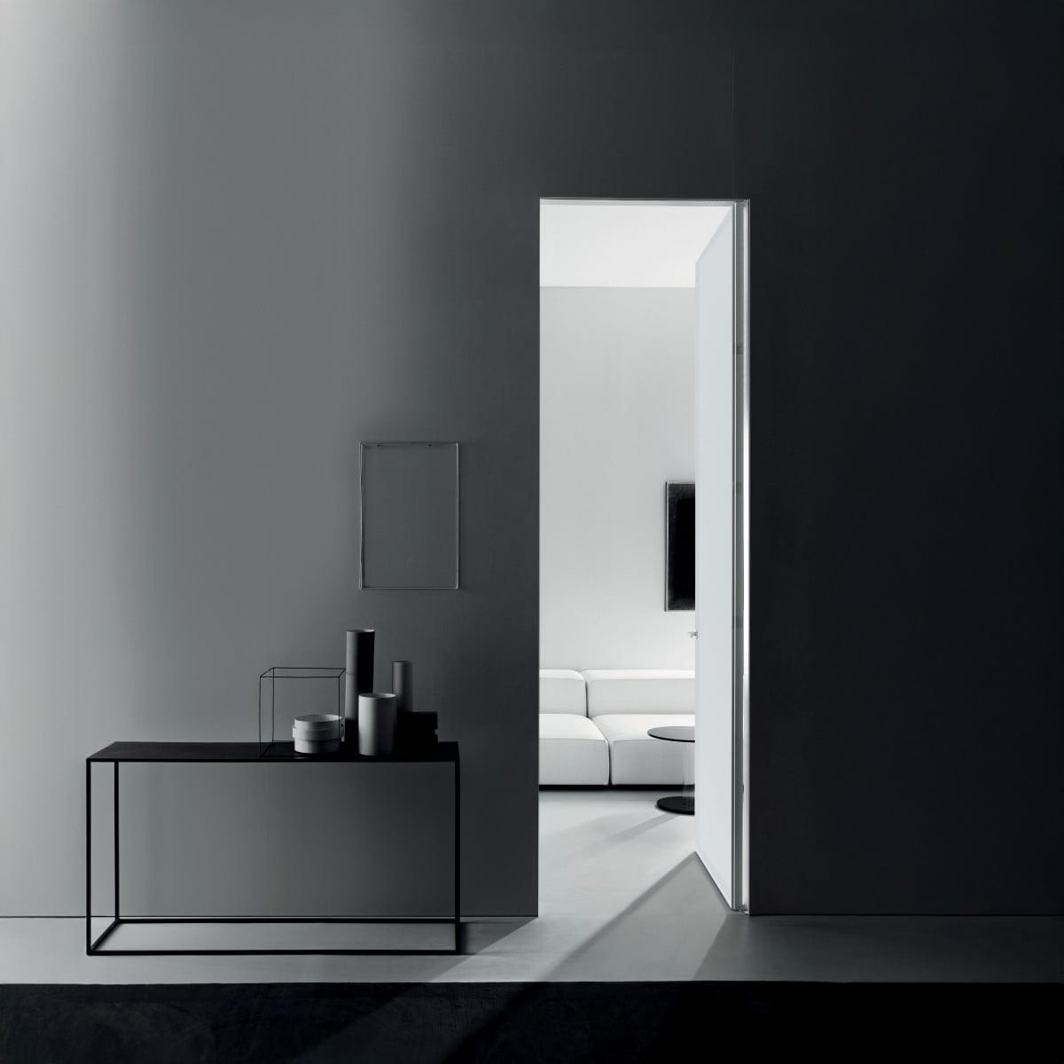 Aladin Swing Plain Duo is a custom-made swing door designed by Piero Lissoni. It reads clean and architectural, with a concealed frame that keeps the line of the opening calm. The door can be specified as a single or double leaf, depending on the space and the kind of passage desired. And for projects that call for an even quieter ceiling line, it is also available with a frame that sits flush with the ceiling.