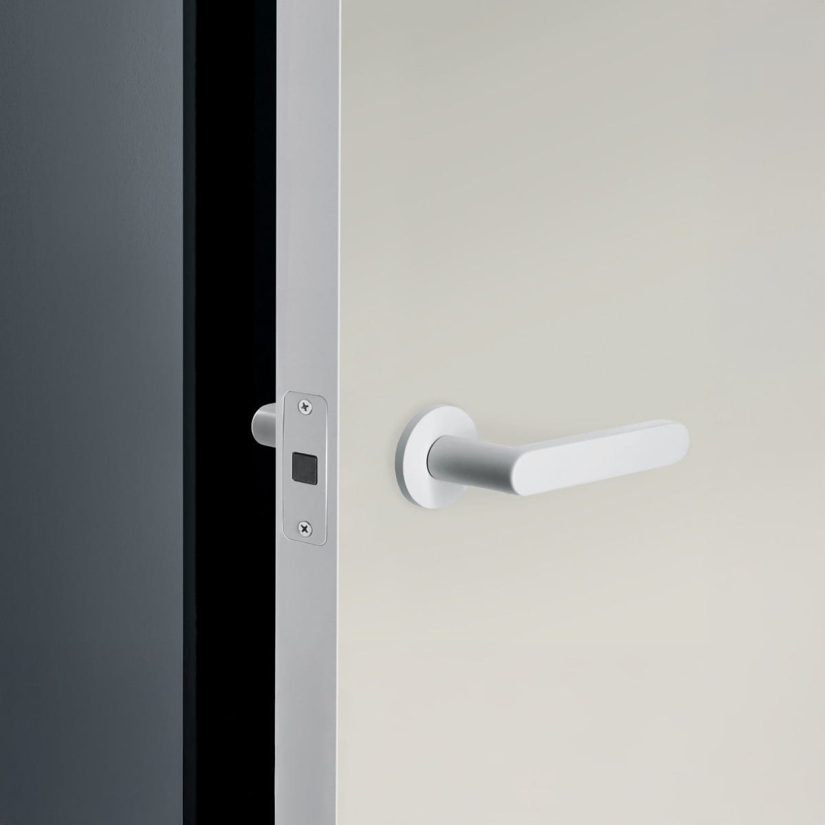 The aluminum subframe is white painted and becomes invisible when the door is closed. It is available for both cement walls and plasterboard, and it can be varnished during wall painting, which helps it blend into the surrounding finish without extra steps.