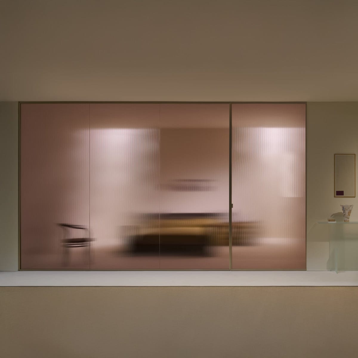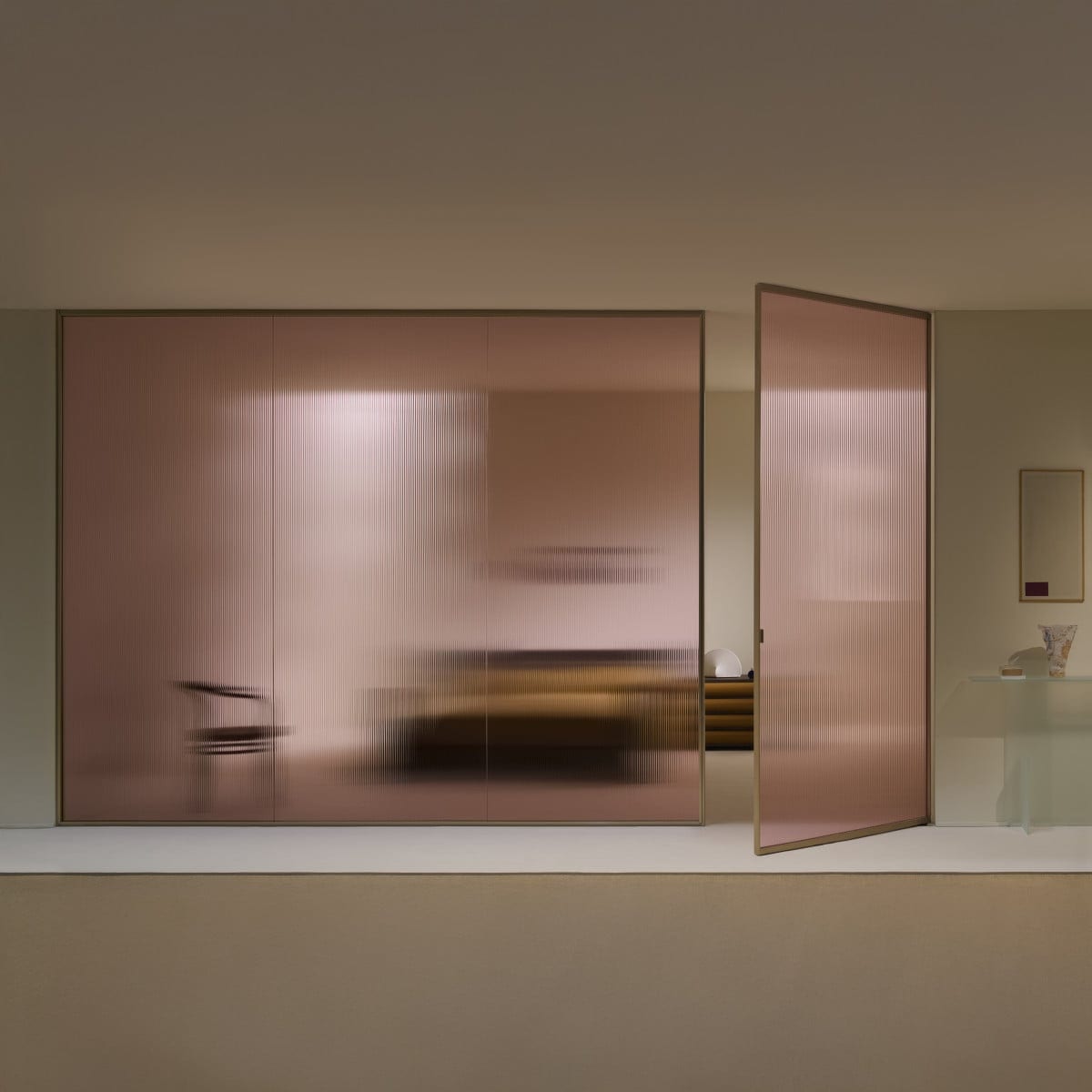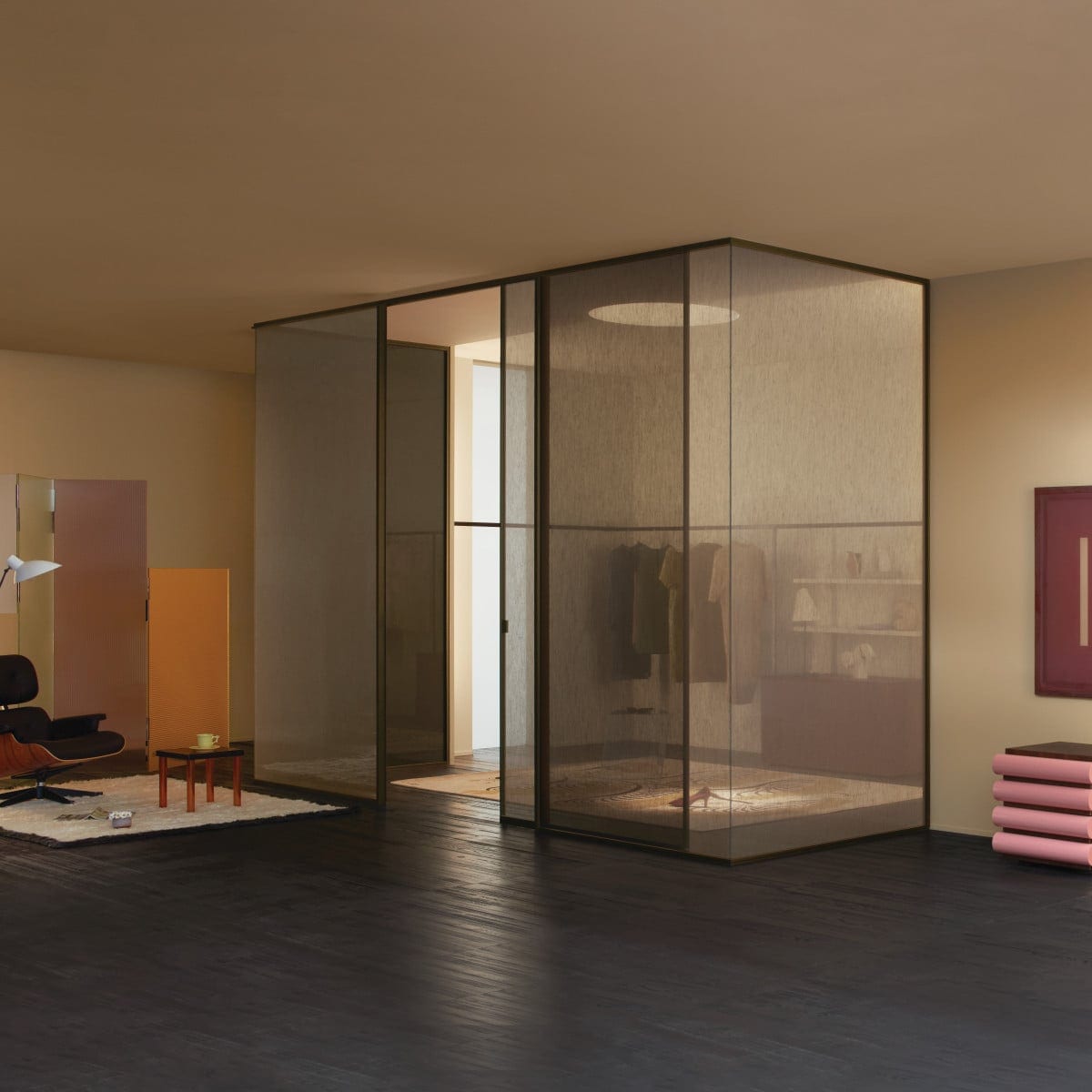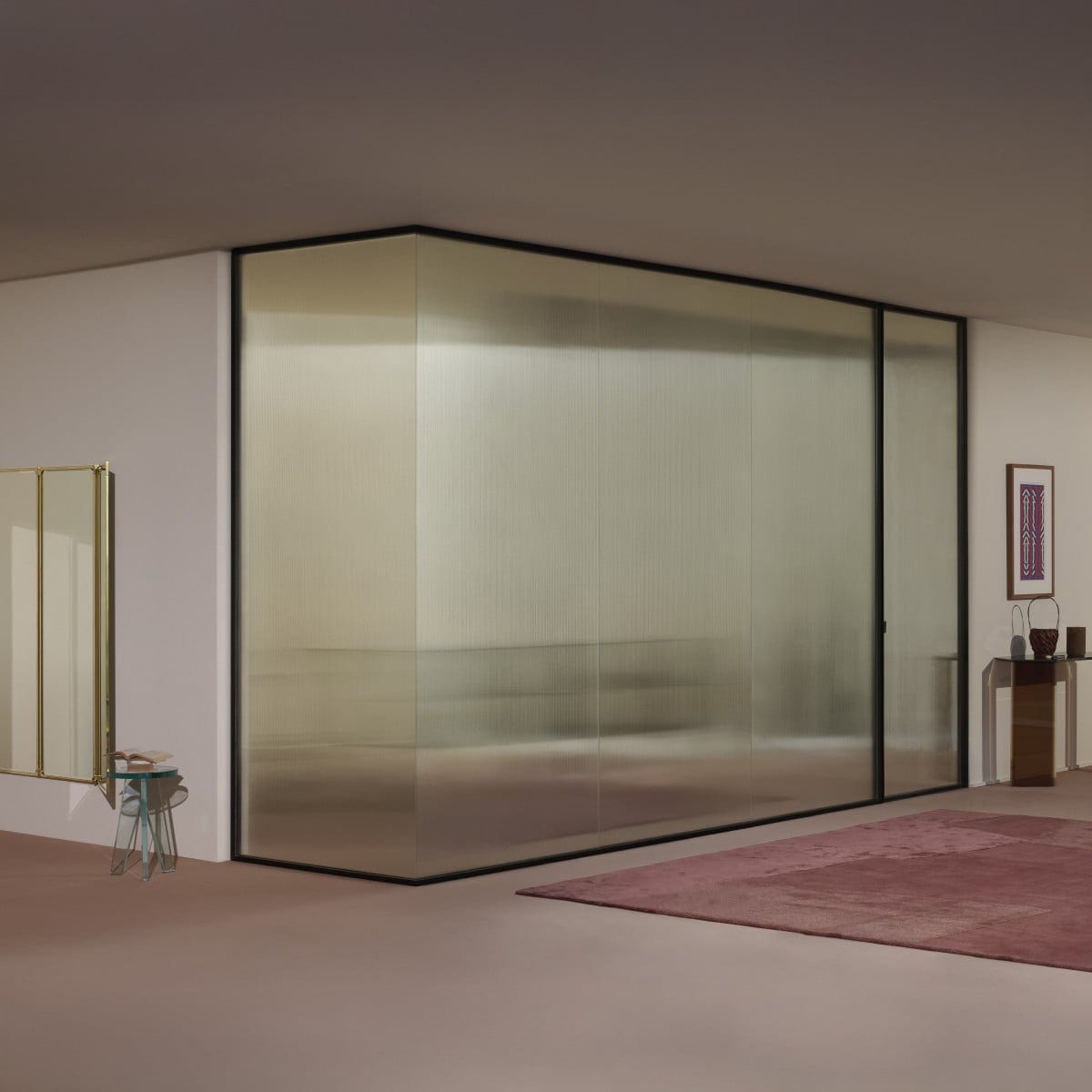 Sherazade Wall is a floor-to-ceiling partition system designed by Piero Lissoni. It reads as architecture more than furniture: clean lines, calm proportions, and a glass plane that stays visually centered. And because the frame is kept tight, the glass finish becomes the real design choice, not an afterthought.