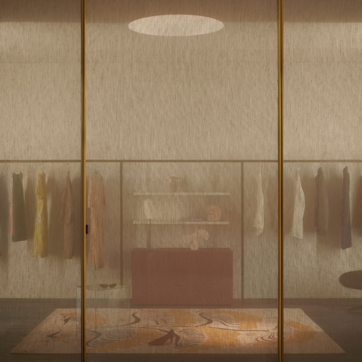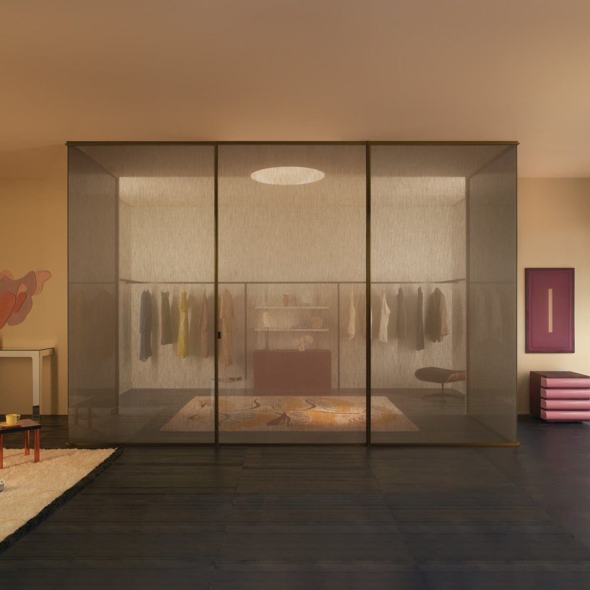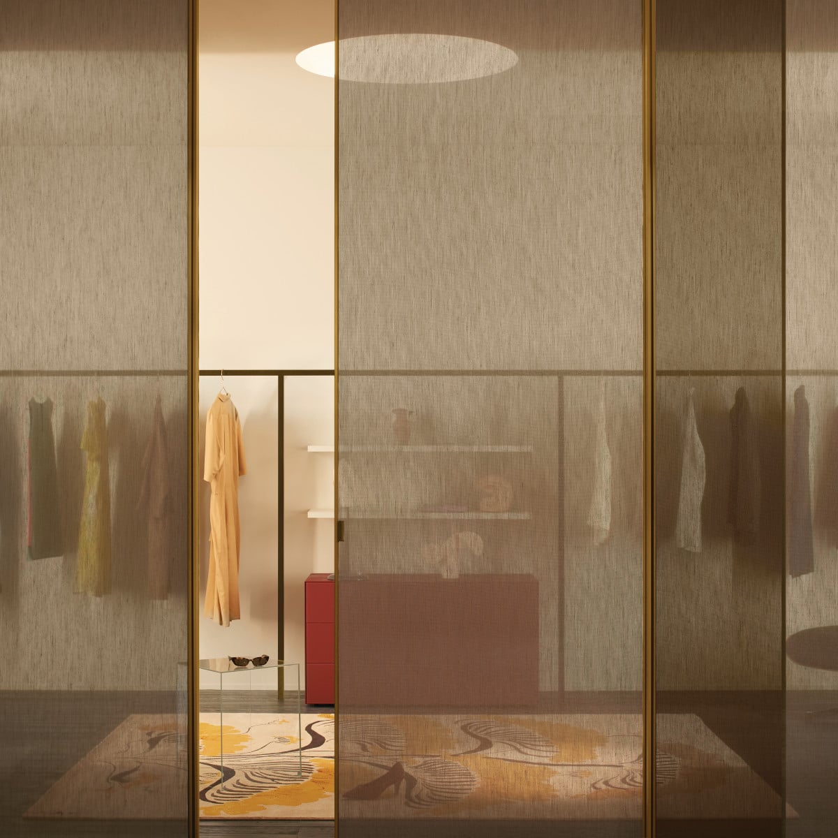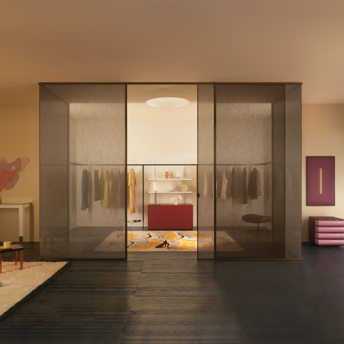 Sherazade Wall is a floor-to-ceiling partition system designed by Piero Lissoni. It reads as architecture more than furniture: clean lines, calm proportions, and a glass plane that stays visually centered. And because the frame is kept tight, the glass finish becomes the real design choice, not an afterthought.