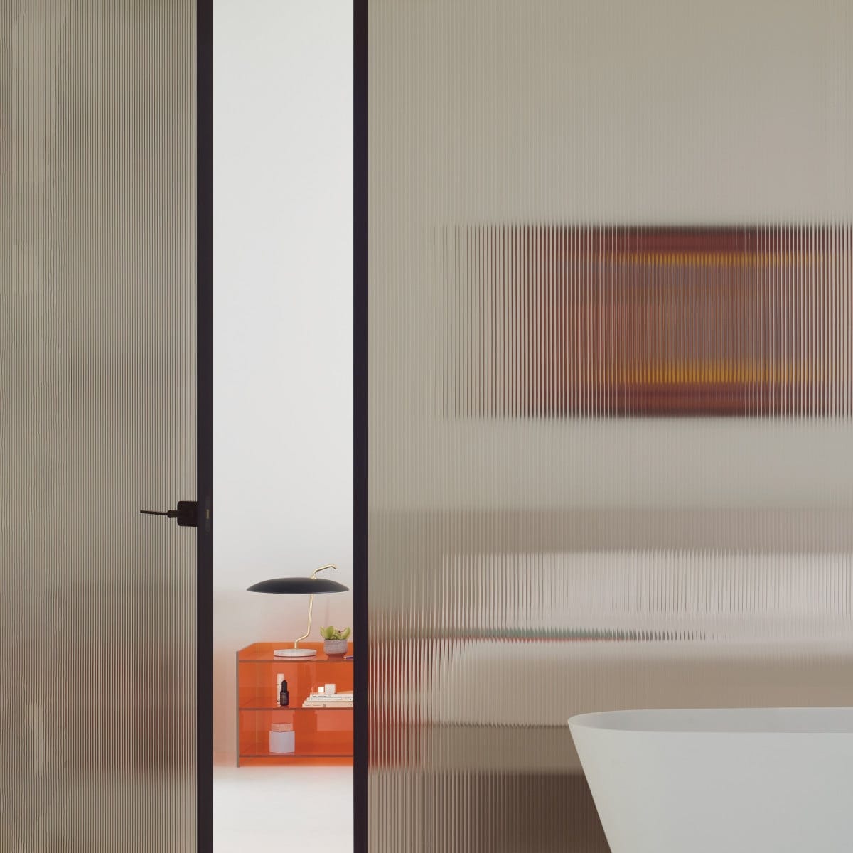 The look can stay discreet or become more graphic, depending on the glass selected. Some finishes keep the space open and bright. Others add pattern, color, or a soft veil. It’s a simple idea, done with enough control that it feels intentional in both residential and contract interiors.