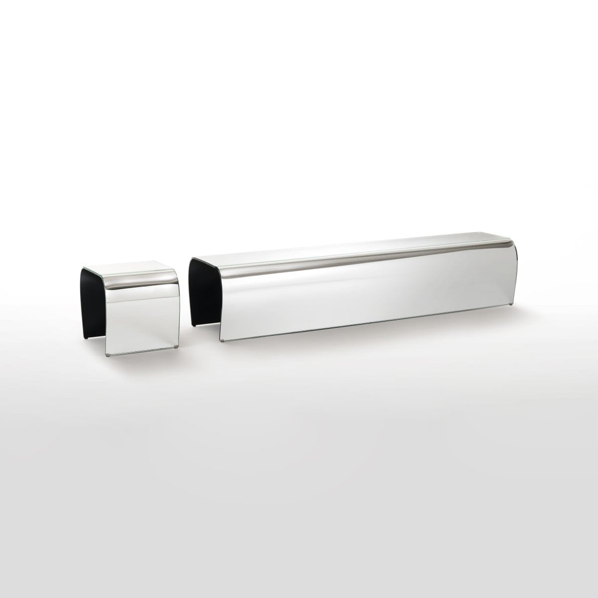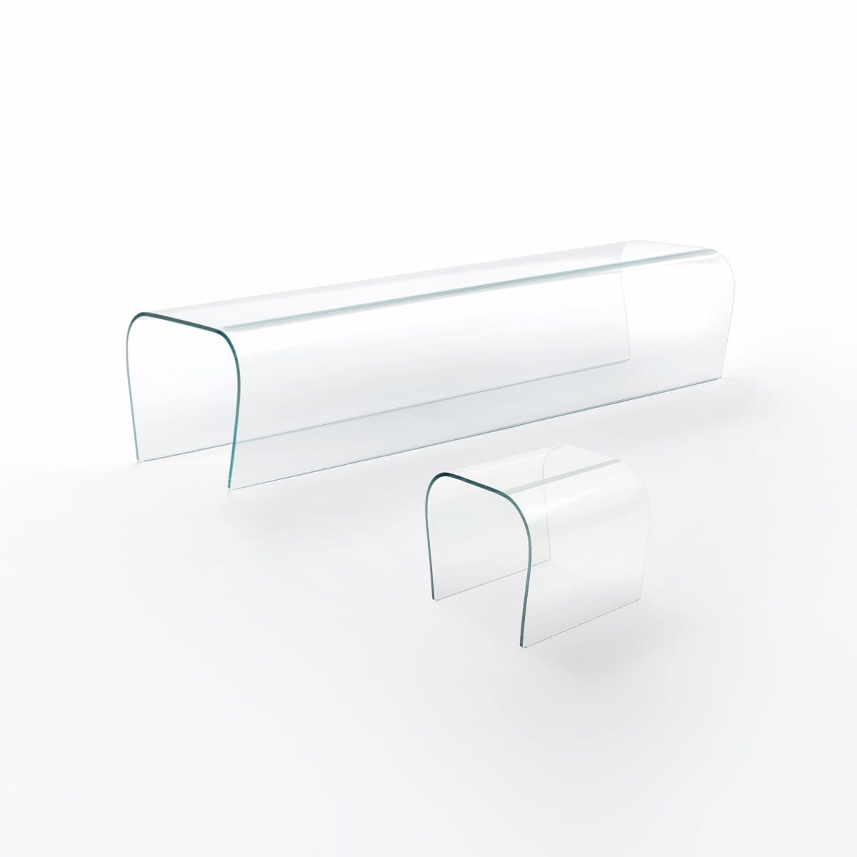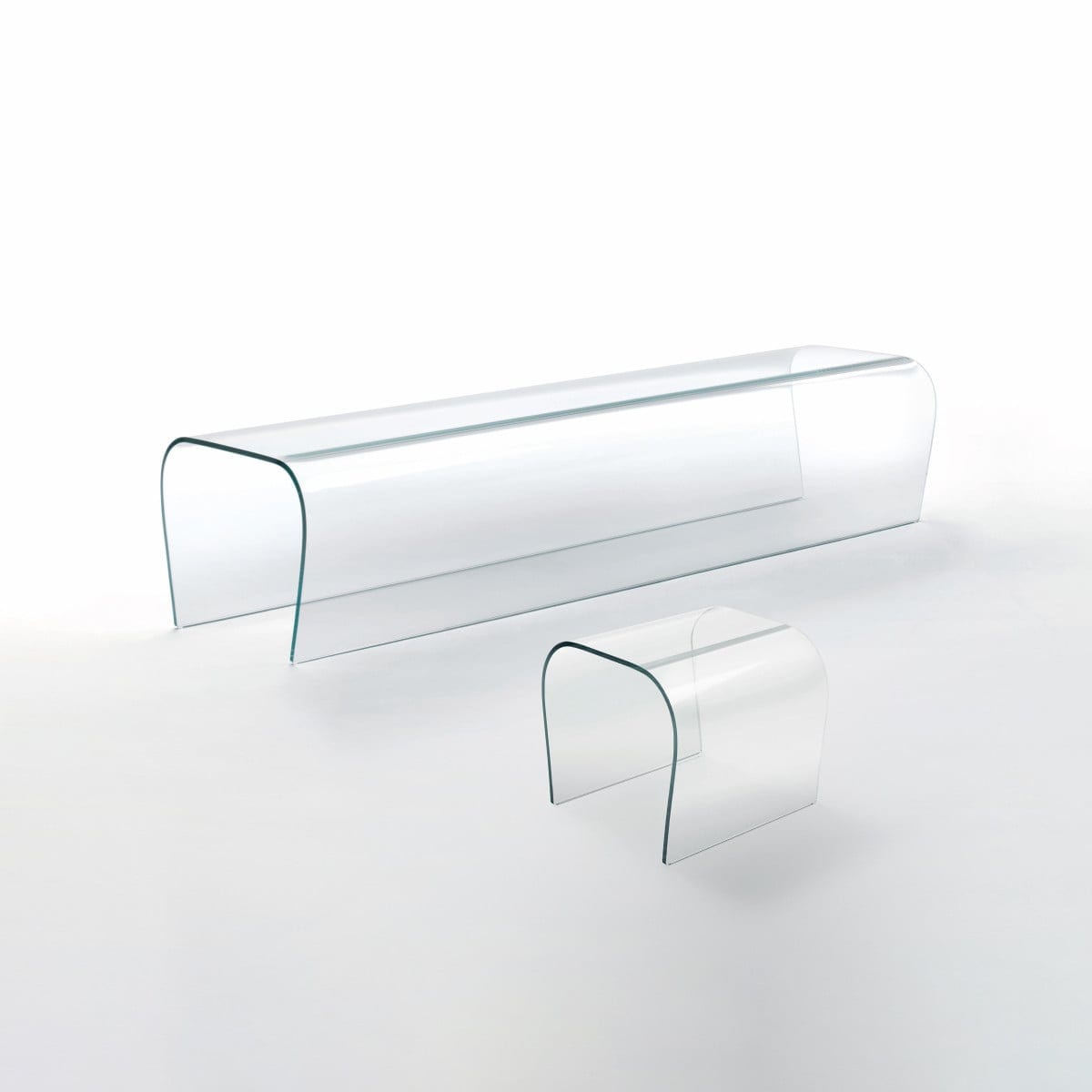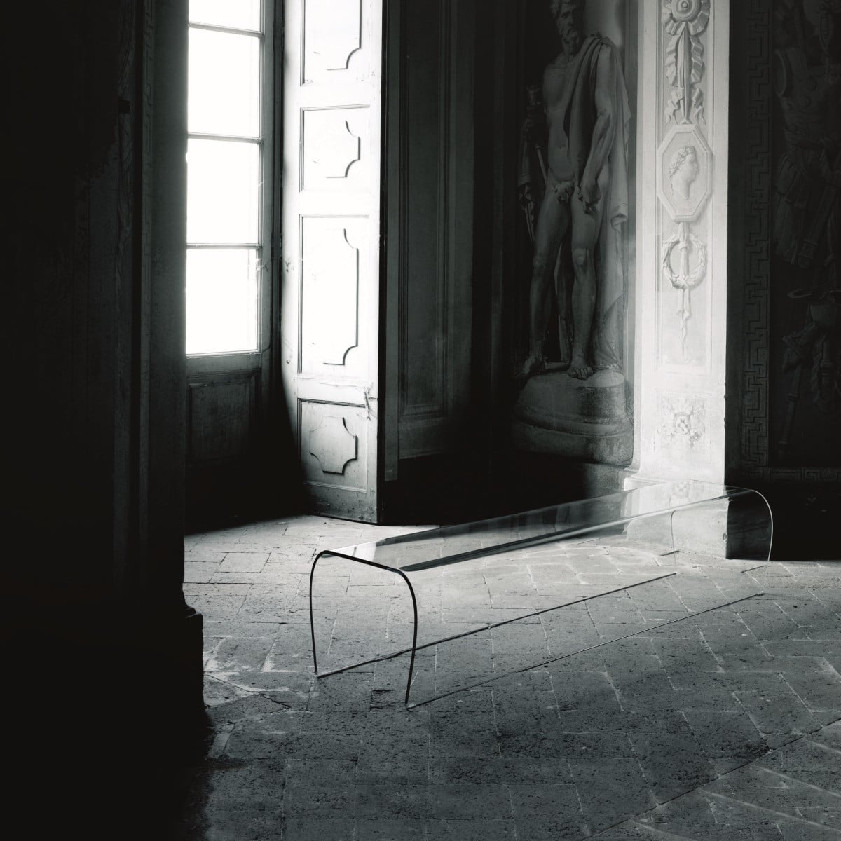 Each piece is made from shaped and curved glass, 15 mm thick, which is about 0.59 inches. In the standard version, it’s transparent extralight glass, chosen for its clarity and bright, low-iron appearance. There is also a silver glass version for a more reflective, precious look. But the design stays the same: a single material, carefully formed.