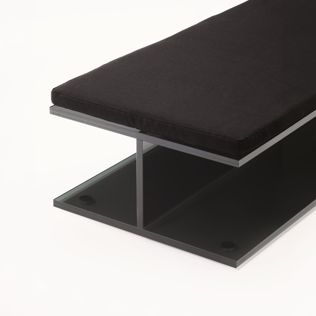 For a harder material, comfort is handled with restraint. Removable cushions in black fabric are available, sized to match the top surfaces. They soften the sit without hiding the glass underneath.