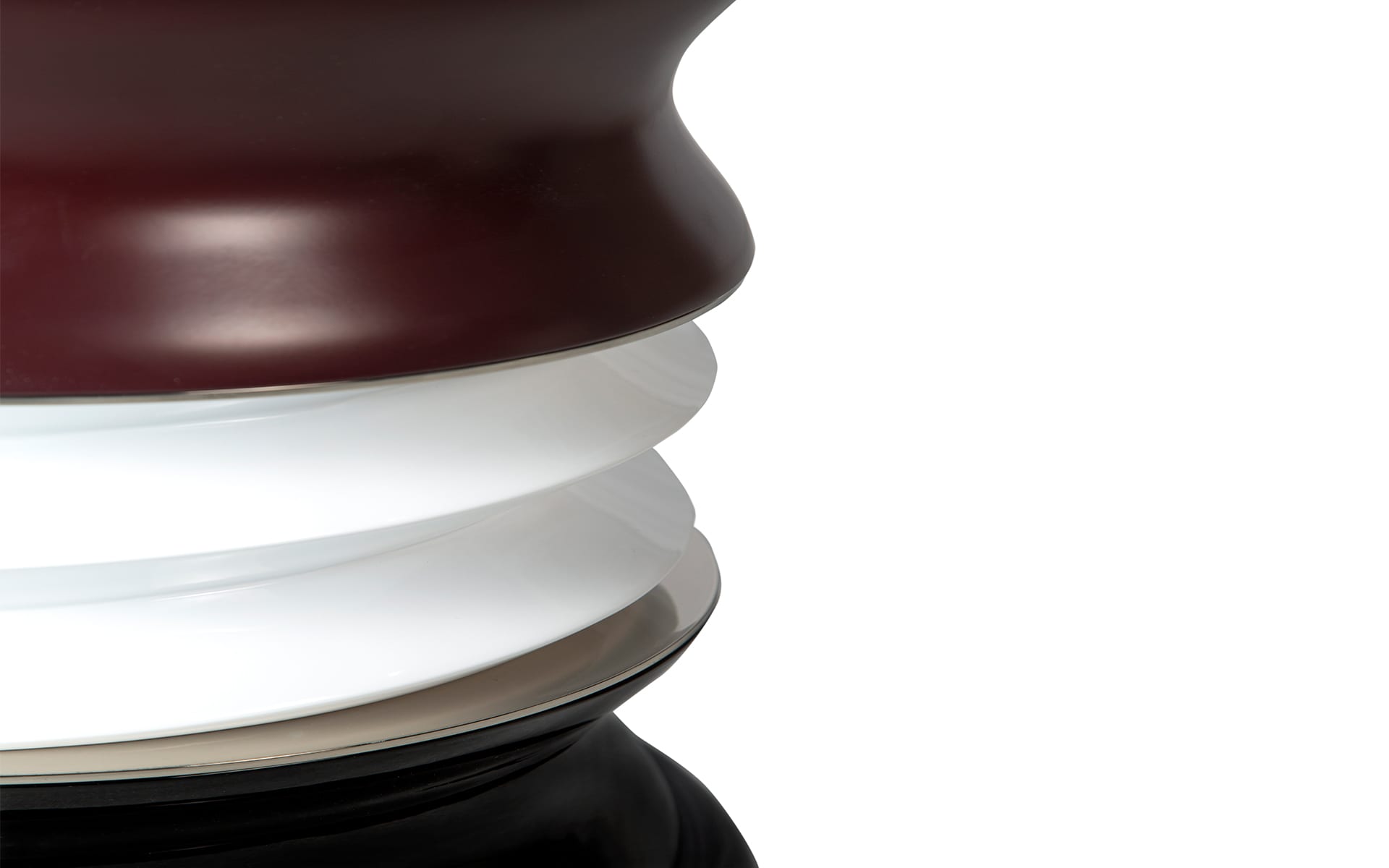The structure is lacquered fiberglass, chosen for its smooth finish and crisp edges. Metallic details are done in plated stainless steel, adding a quiet contrast and a bit of sharpness to the softer curves. Marble and metal accents bring in a more architectural feel, but the overall look stays understated.