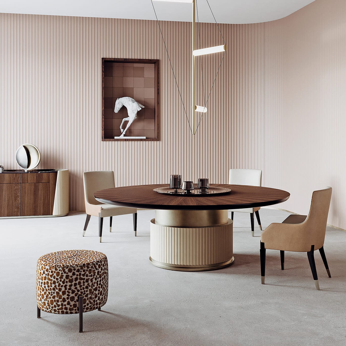 The shape encourages movement around it. It works as a central piece in front of a sofa or as a side perch that can be pulled closer when guests arrive.