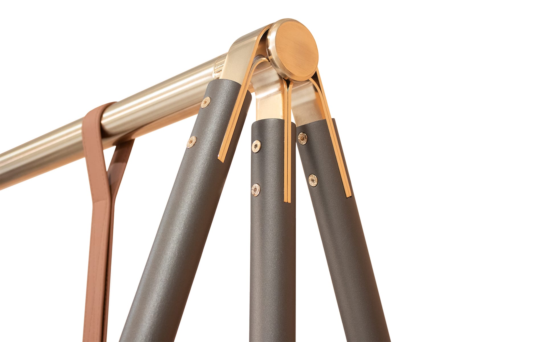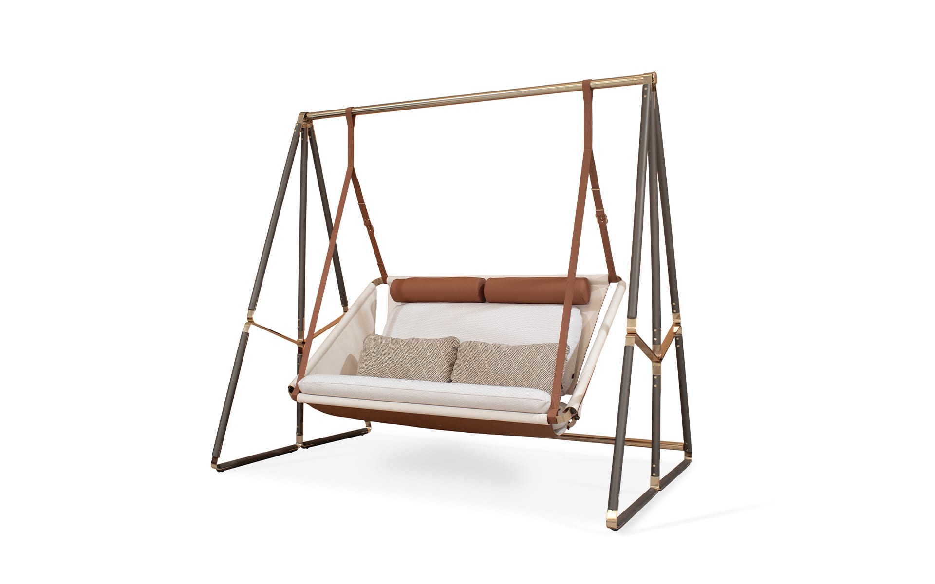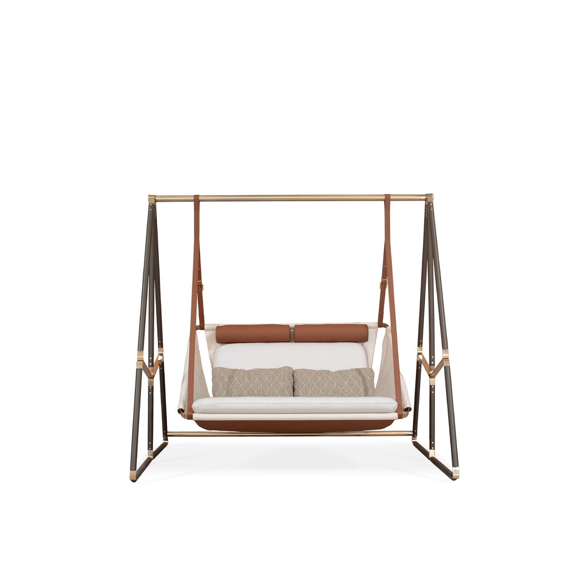 Myface builds the Allure Swing Sofa on a lacquered stainless steel structure, with plated stainless steel metallic details for a crisp, polished contrast. The upholstery is acrylic fabric, chosen for outdoor use, while the straps are made in outdoor leather for a more refined touch.