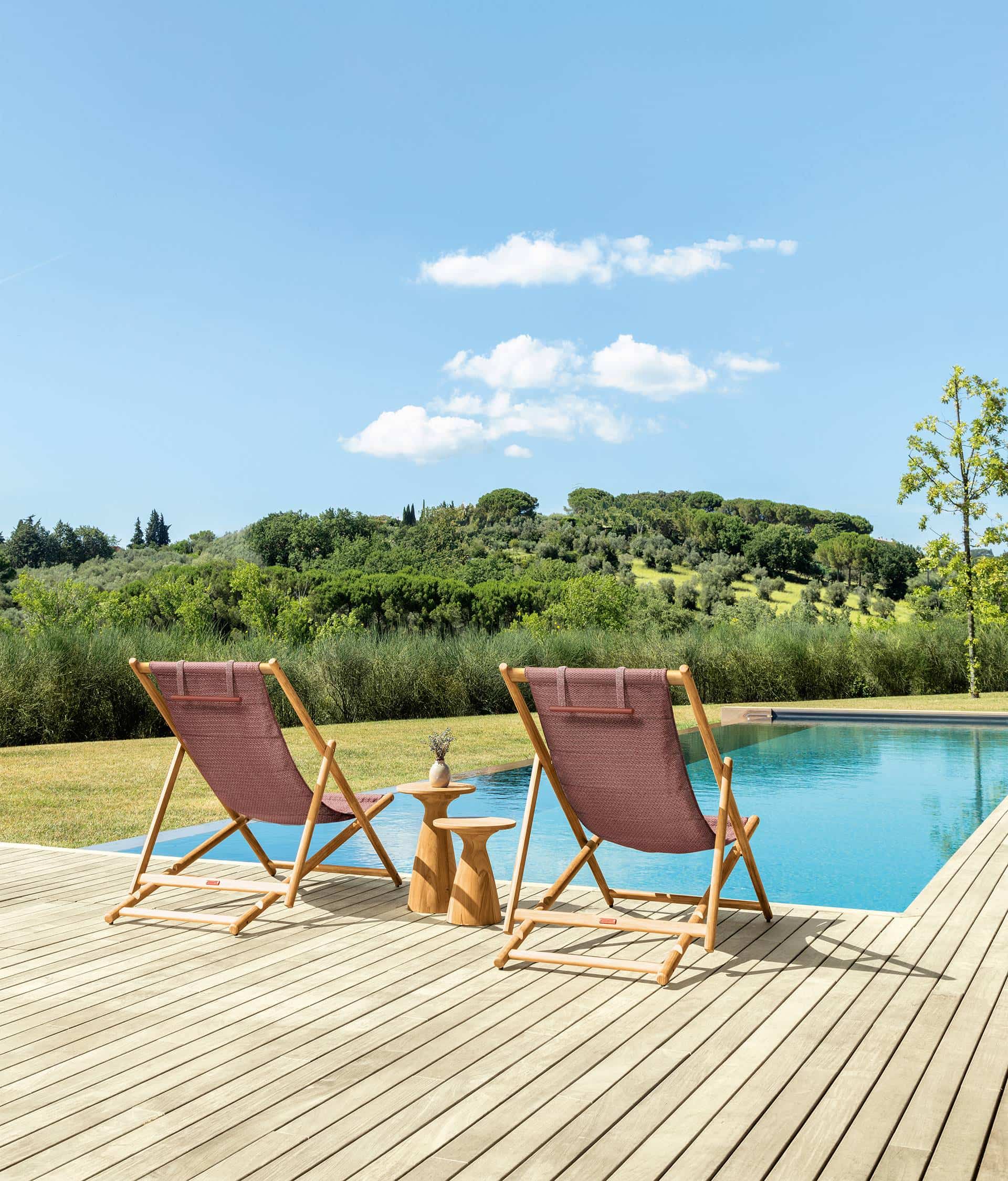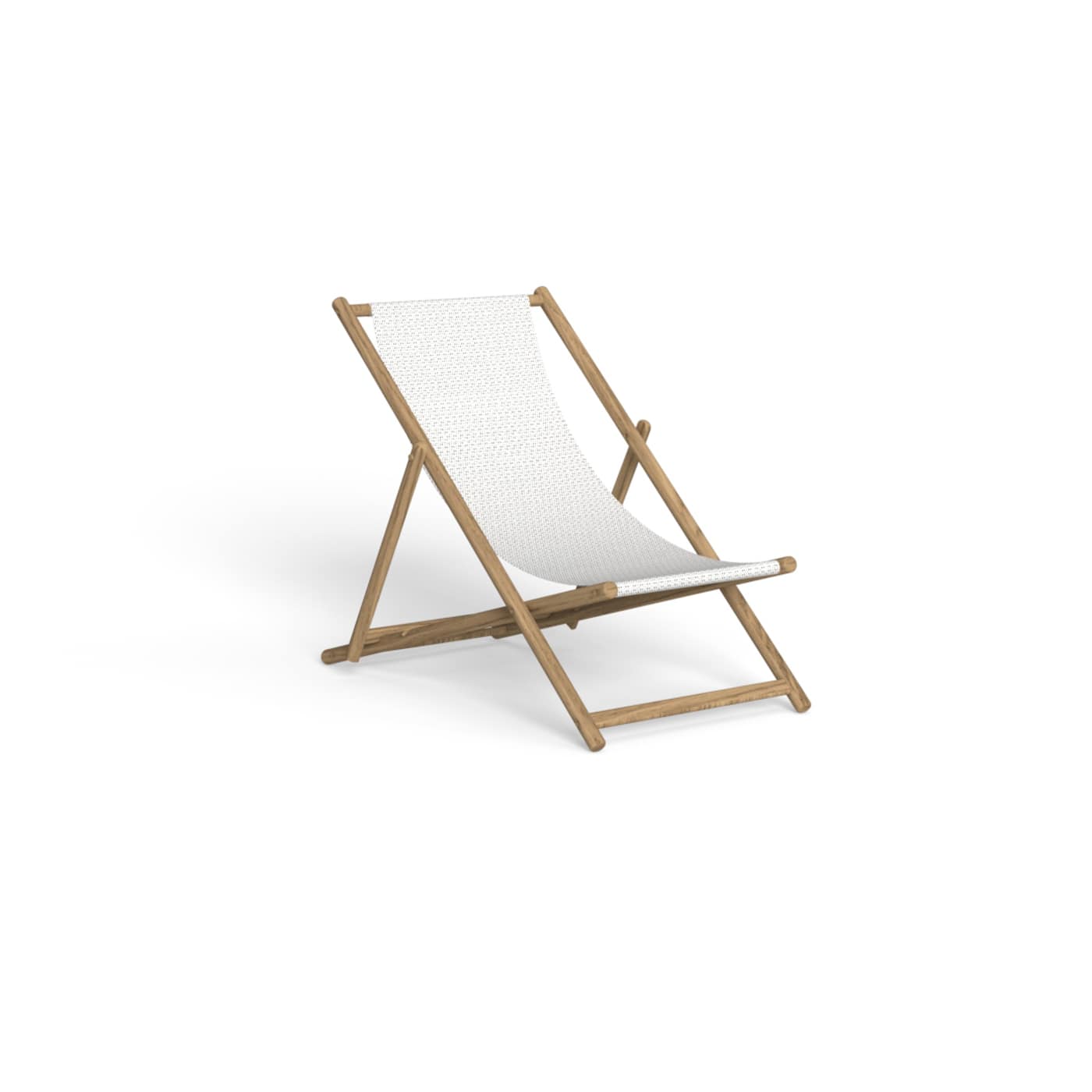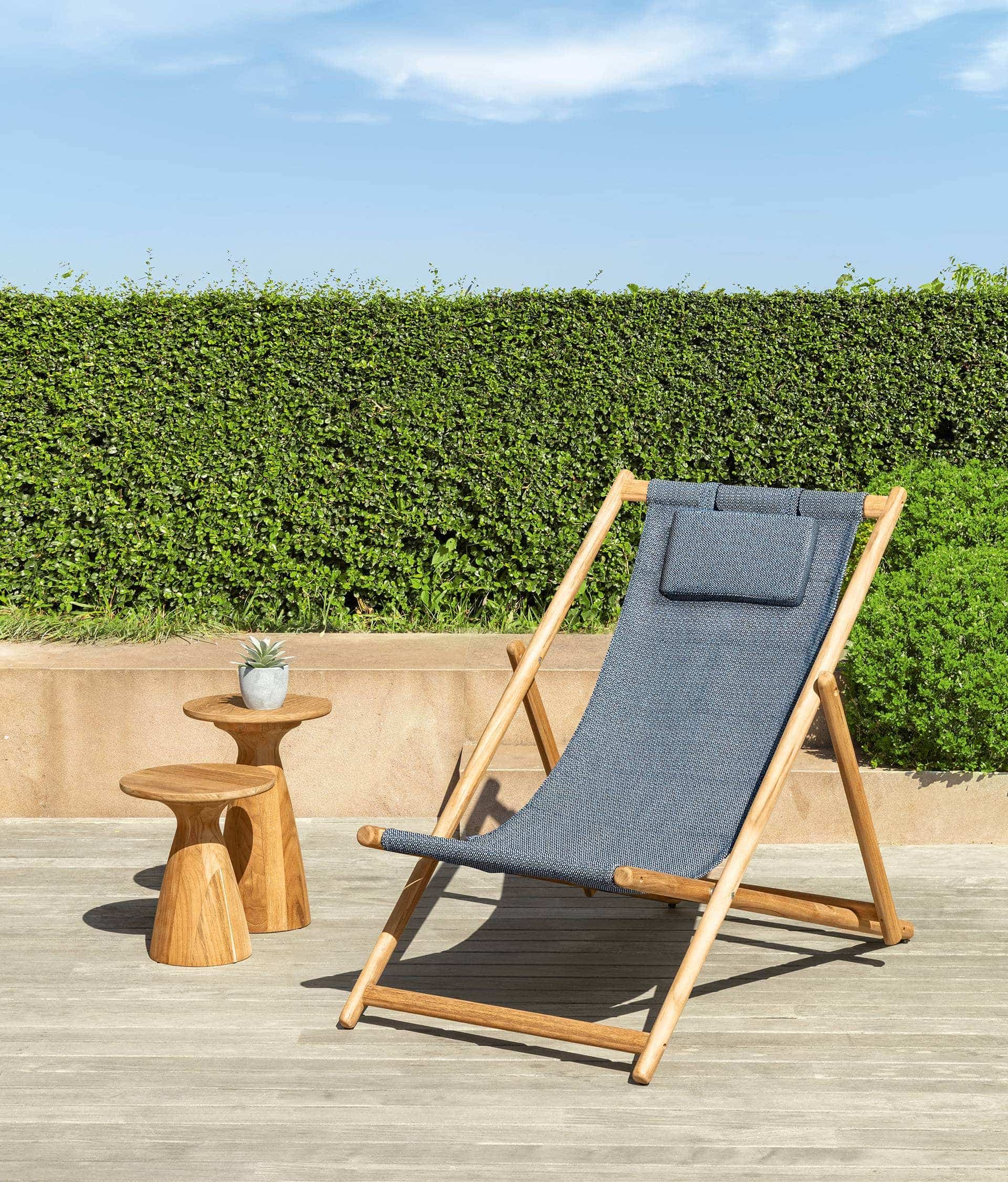 A teak wood frame anchors the piece, chosen for its natural strength and outdoor readiness. The Dolcevita Deck Chair comes in natural teak or a teak silver finish, paired with Dune fabric tones that range from White and Grey to Red, Green, or Blue. It’s a straightforward, honest construction: wood where it needs structure, fabric where it needs give. Packaged one per box, it arrives ready to put to use.
