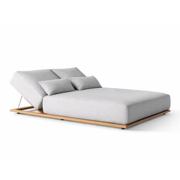 Visually, the design is deliberately restrained. A minimalist wooden platform forms the base, giving the sunbed a grounded yet floating appearance. This structural clarity is complemented by thick, tailored cushions upholstered in neutral tones, allowing the piece to integrate effortlessly into both contemporary outdoor landscapes and sophisticated indoor spaces.