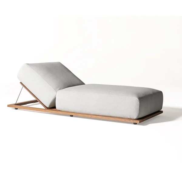 Crafted with a minimalist wooden base, the Morbido sunbed introduces a grounded, architectural presence while maintaining a light, effortless aesthetic. The natural wood frame subtly elevates the generously cushioned seat, creating a floating effect that enhances its contemporary appeal. Paired with soft, neutral-toned upholstery, the design blends effortlessly into a wide range of environments—from serene poolside settings to curated interior lounges.
