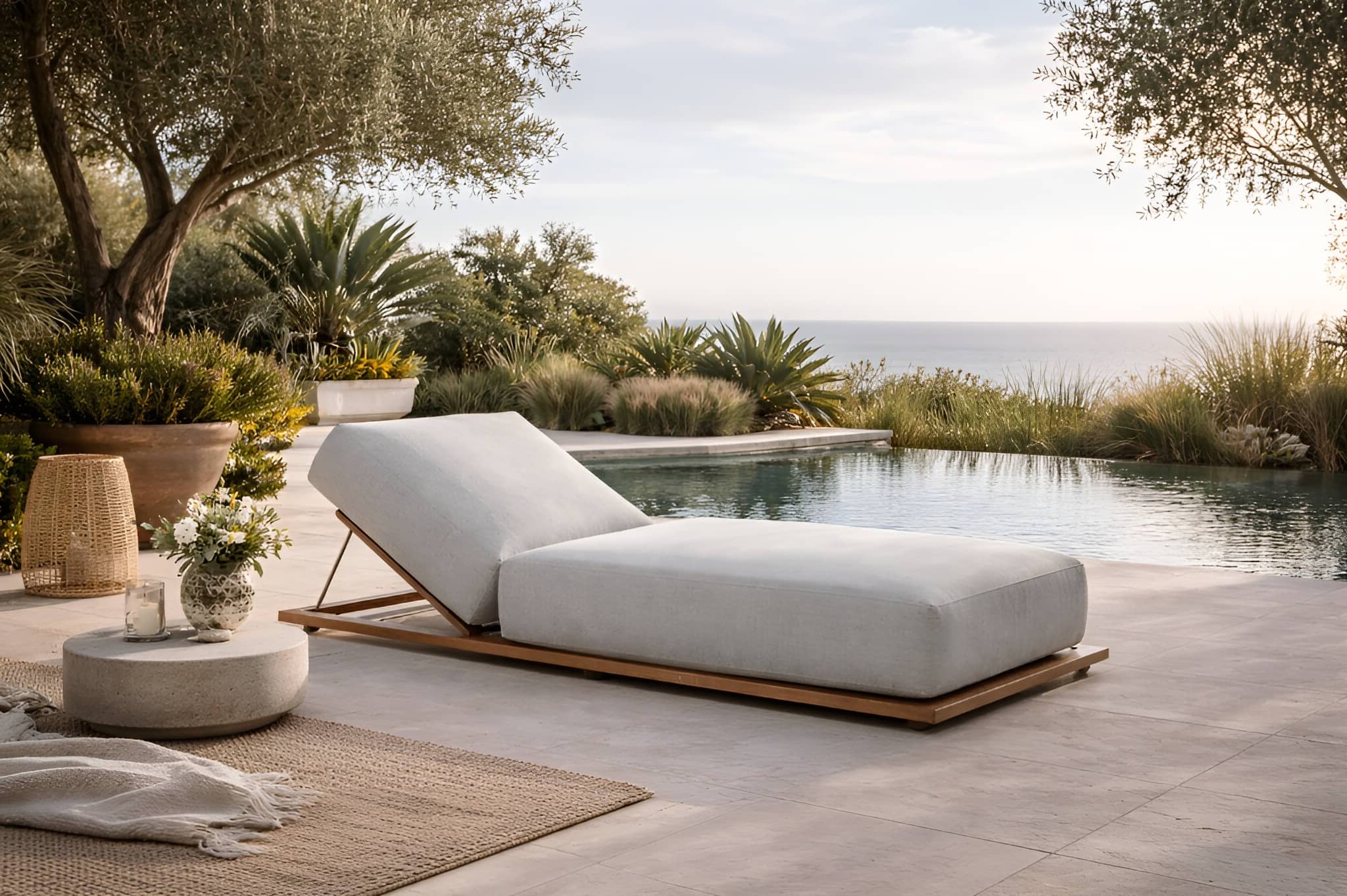 This designer chaise lounge is ideal for luxury patios, poolside decks, spa environments, and modern interiors seeking a statement piece that doesn’t rely on excess. Its understated presence allows it to complement rather than compete, making it a favorite for designers who prioritize balance and restraint.