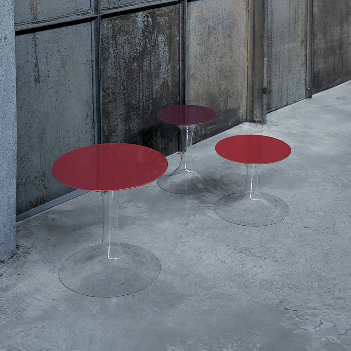 Funghetti tavoli bassi is a small collection of round low tables designed by Piero Lissoni. The look is clean and intentional: a crisp circular top paired with a clear, sculpted base that reads light from across the room. It has presence without asking for attention.