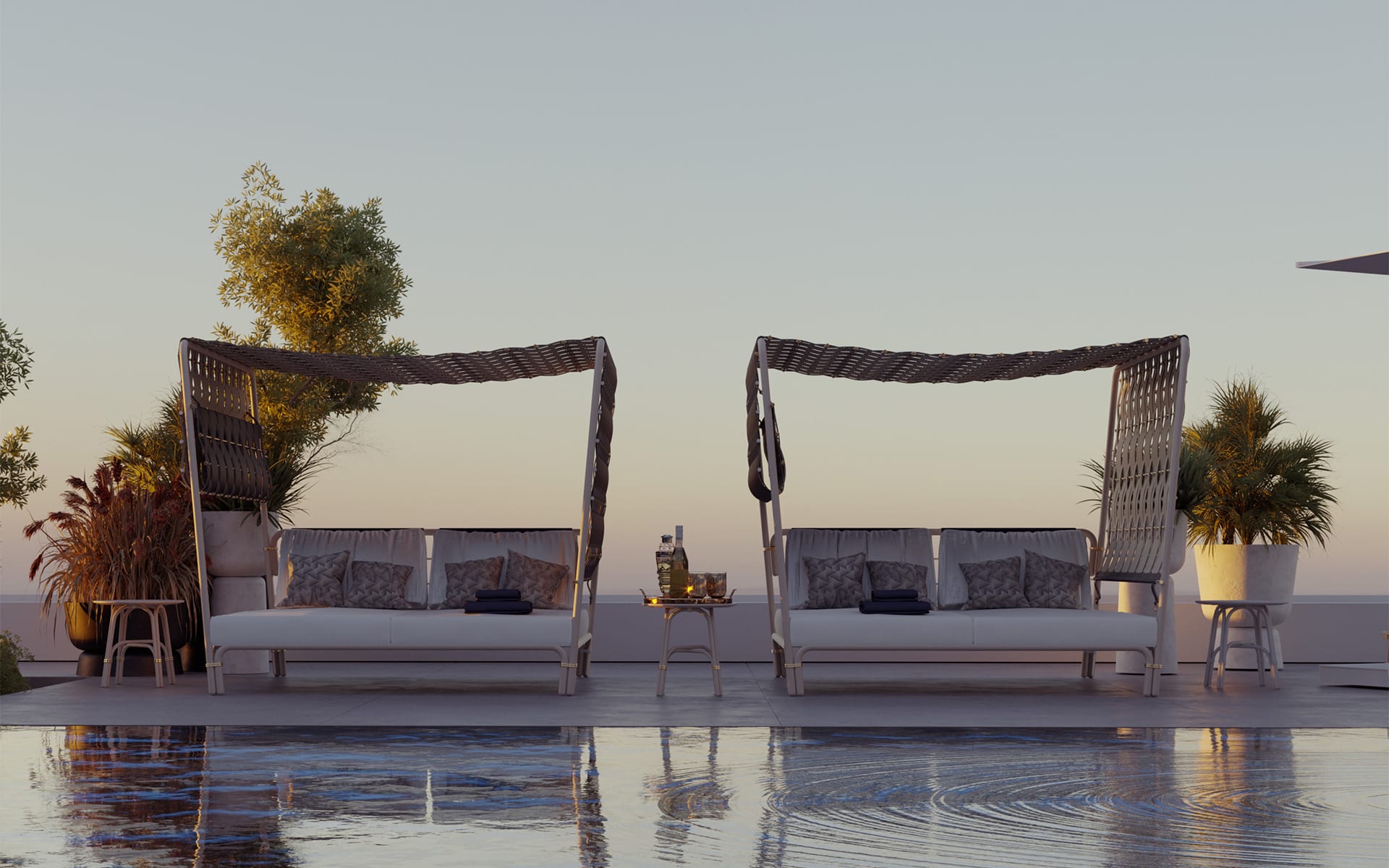It’s available with two different tops, giving some flexibility in how the table is finished and how it pairs with surrounding materials. A protection cover is included, which matters when the table lives on a terrace or by the pool and needs an easy layer of care between uses.
