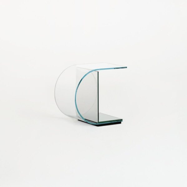 The Ollie table reads as one continuous gesture: a clear glass plate bent to a full 180° curve. It’s simple at first glance, but the shape does the work. The curve softens the profile and gives the piece its character without asking for attention. And because the glass is extralight, the form stays crisp rather than tinted.