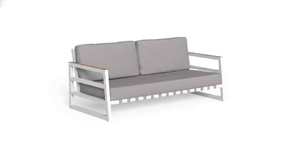 The Alabama//Alu Two-seater sofa brings a measured calm to open air settings. Lines are clear, proportions balanced, and every surface earns its place. A slim teak slat traces the upper edge of the arms and back, softening the silhouette and giving the eye a natural pause. Nothing shouts; the form relies on restraint and thoughtful detail.