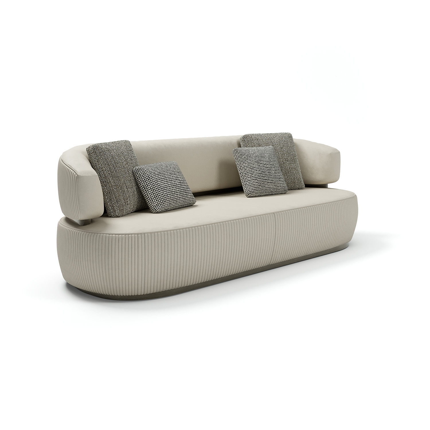 On the back, the shell opens to reveal a distinctive metal finishing element. It is a quiet detail, yet it defines the sofa from every angle. At around 33.9 inches high, the profile sits low enough to feel relaxed, high enough to frame a room and hold its own in larger spaces.