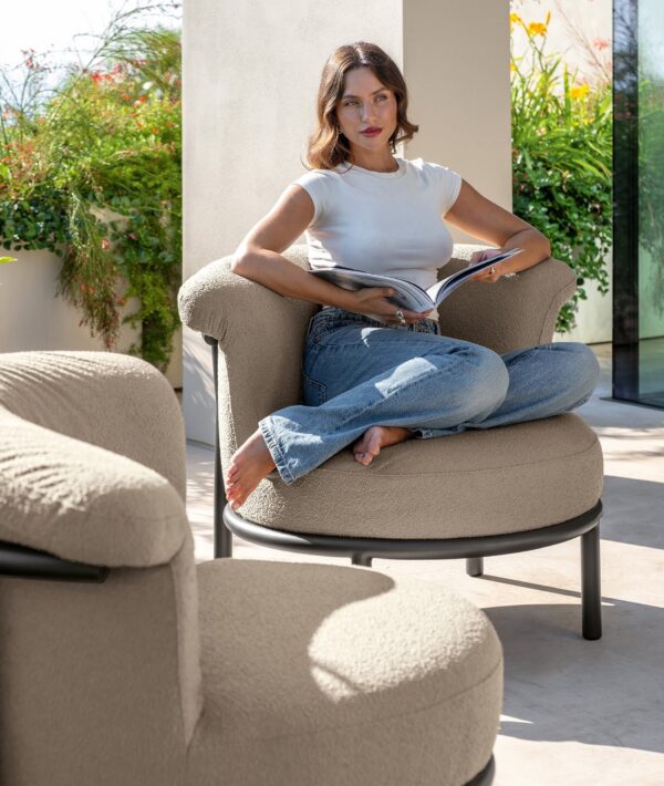 A powder-coated aluminum frame sets the structure: strong, stable, and notably lightweight. The finish is even and resilient, keeping the lines crisp over time. Fabric cushions complete the form, tailored to sit cleanly within the frame without bulk.