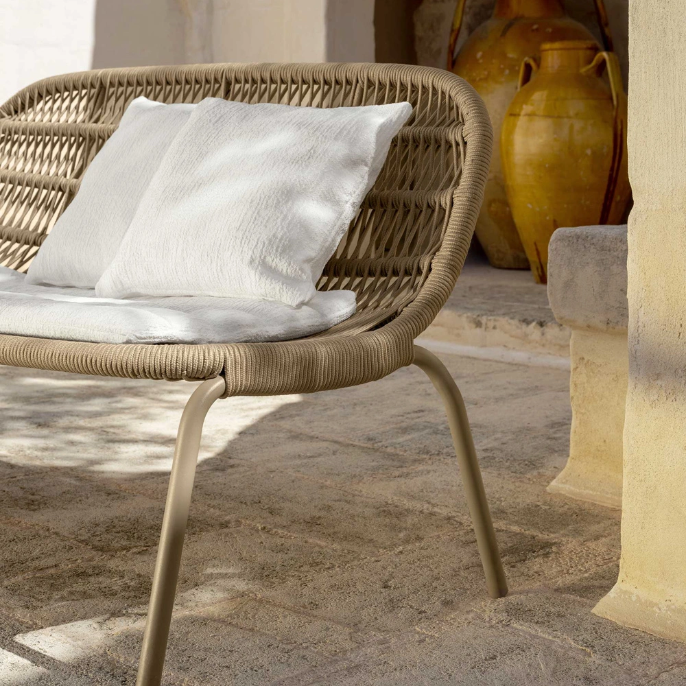 Comfort here isn’t overbuilt; it’s considered. The gentle curve wraps the body just enough, while the rope has a subtle give that reads as supportive, not stiff. The seat’s breadth encourages shifting positions—sit upright for conversation, lean back when the afternoon slows. And for those who prefer a plusher sit, the optional cushions soften the experience without masking the sofa’s sculpted lines. The result feels natural outdoors: easy, breathable, and ready for a long stretch of time spent doing as little as possible.