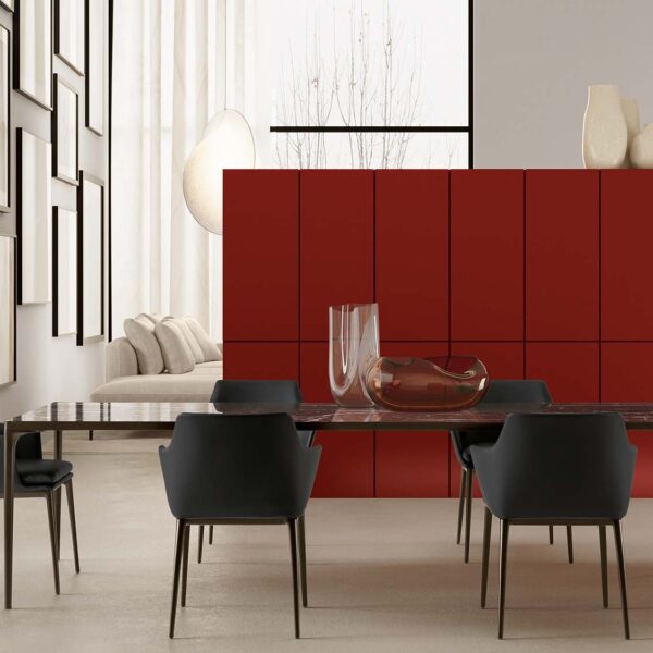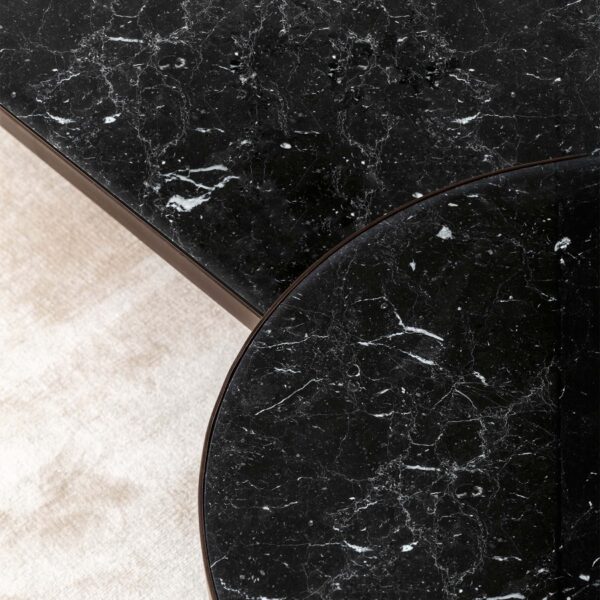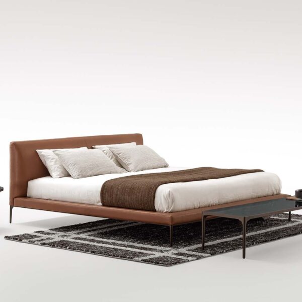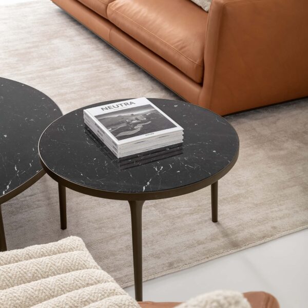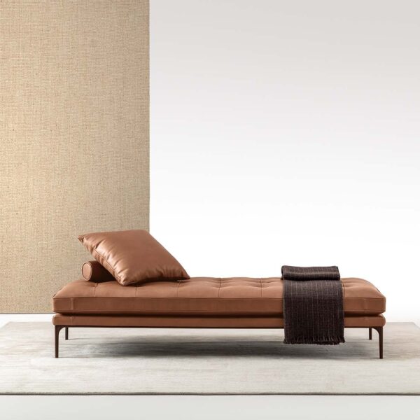 The feet are die-cast aluminium, finished in burnished, chrome, or glossy black, with thermoplastic polymer glides to protect floors. Upholstery comes in a wide range of fabric categories, from A through LUX, plus leather options in Category F and G LUX. So there’s real flexibility to match it to an existing interior or build a room around it.