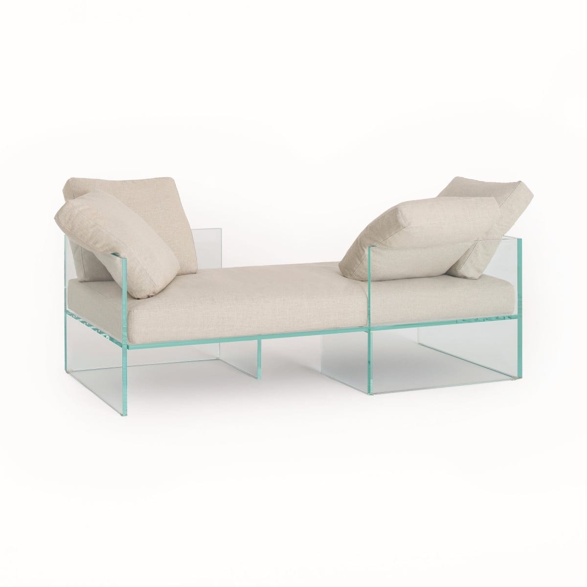 The structure is made from 19 mm thick transparent extralight glass, shaped, tempered, and UV-bonded. That translates to roughly 0.75 inches of glass, executed with the kind of control needed for a piece that is meant to look almost effortless. The clarity matters here. It keeps the sofa feeling open in the room, even at full size.