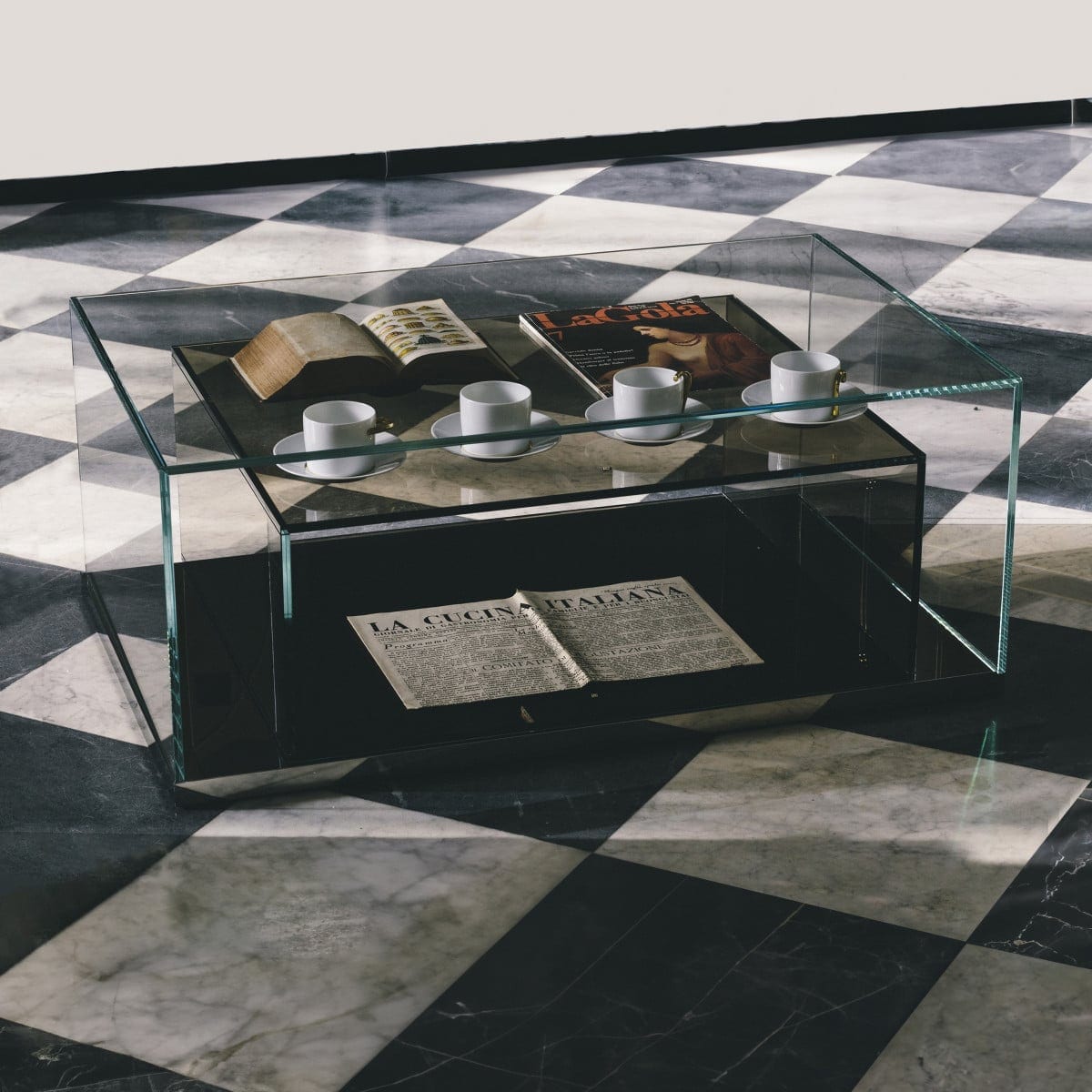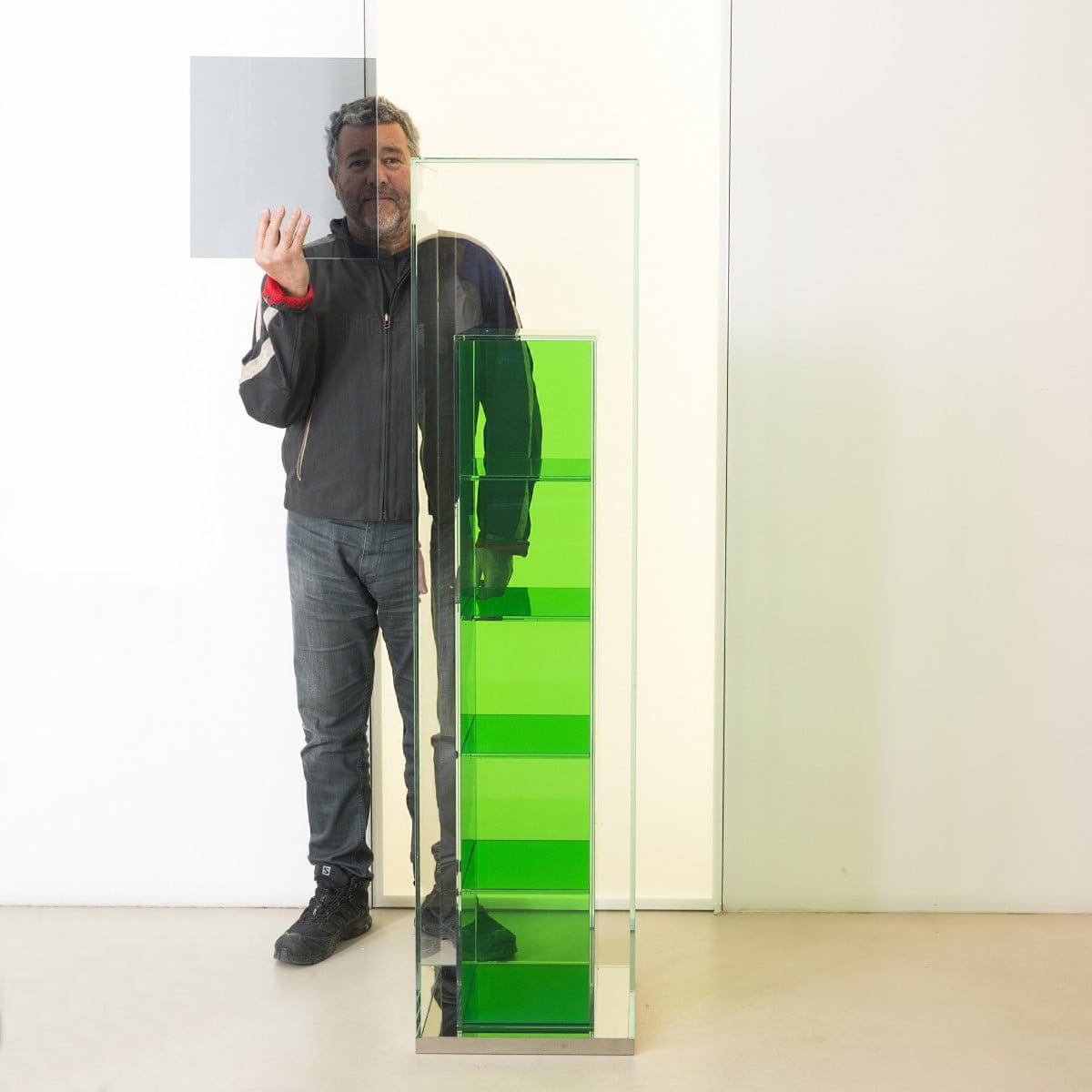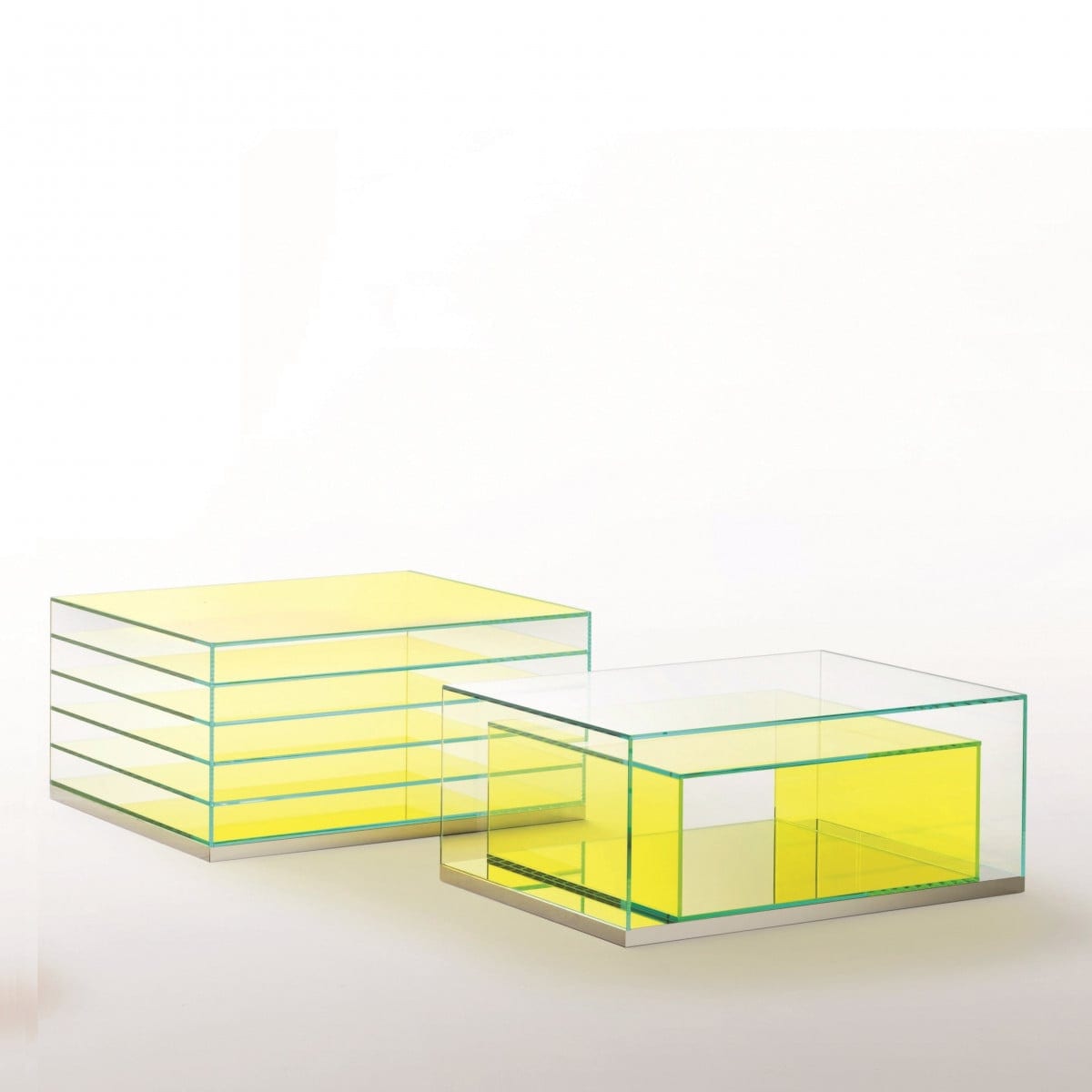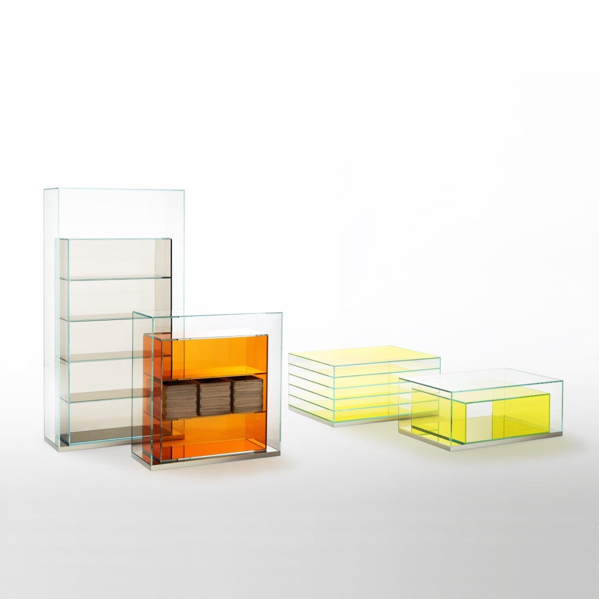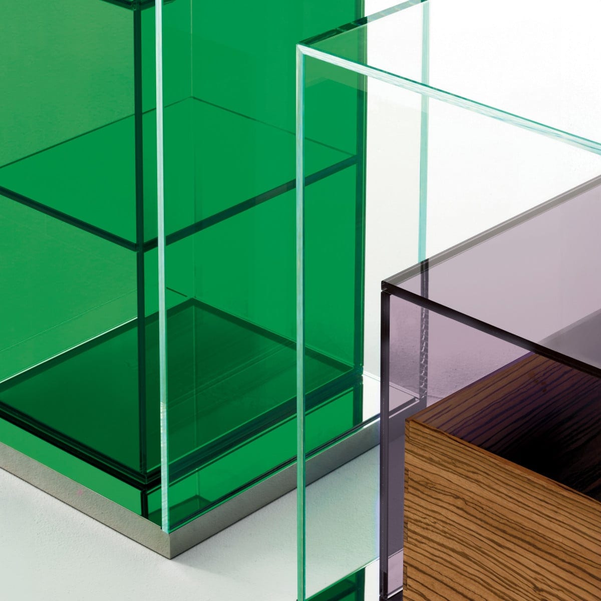 Each unit is made in laminated 5+5 mm extralight glass, thermo-welded and glued at 45° for sharp, precise corners. The base is reflective polished stainless steel, a small detail that changes the whole read of the piece by catching light and echoing the room around it. Inside the clear outer structure, a second component brings the storage function in transparent coloured glass, adding a subtle tint without closing things off.