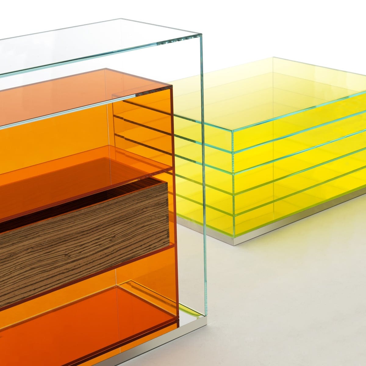This is storage that stays visually light. Items can be kept close at hand without turning the room into a collection of solid blocks. The inner coloured-glass element gives a clear boundary for what gets stored, while the outer extralight shell keeps the overall silhouette quiet. But it still feels intentional, especially when the stainless base mirrors the floor and makes the piece appear to float.