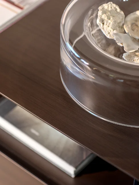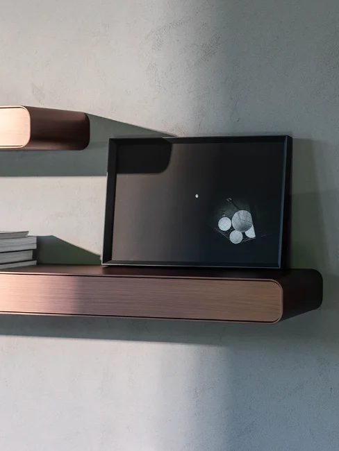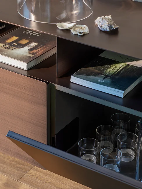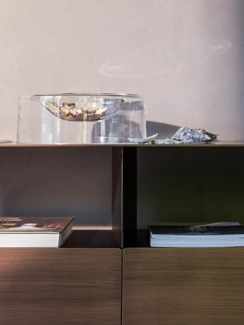 Notably, the Foglio cupboard features a double-face design available in a striking metallic oxide finish, making it perfect for positioning in the middle of a room. This innovative design element not only outlines pathways but also discreetly separates spaces, adding functionality to its elegant form. Overall, Foglio exemplifies the perfect marriage of modern aesthetics and practical design, making it a standout choice for contemporary living.
