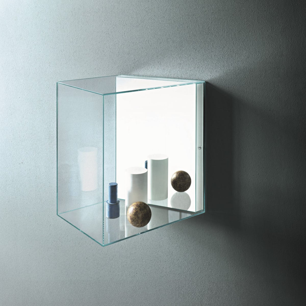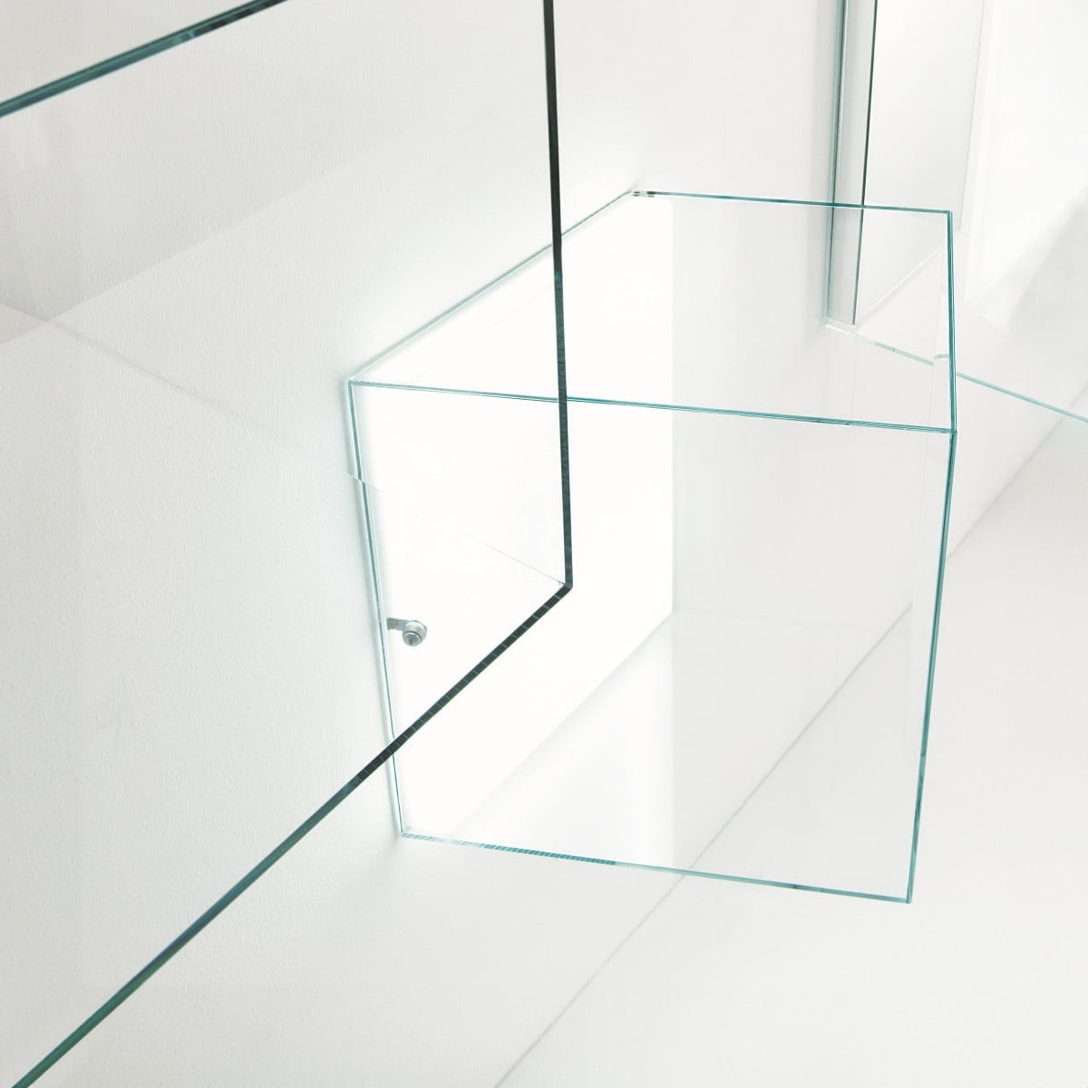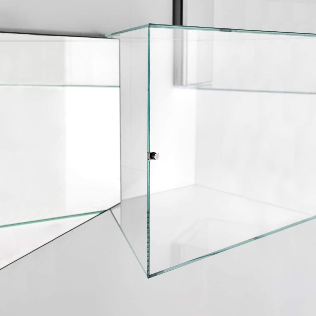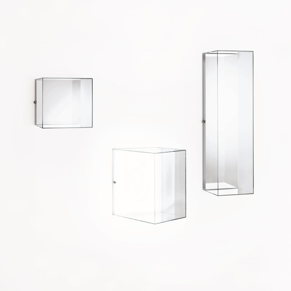Each case is made in transparent extralight tempered glass, 6 mm thick, with panels glued at 45° for sharp, precise corners. It’s a technical build, but it doesn’t look technical. The glass stays clear and bright, so the content reads true in natural light or evening light.