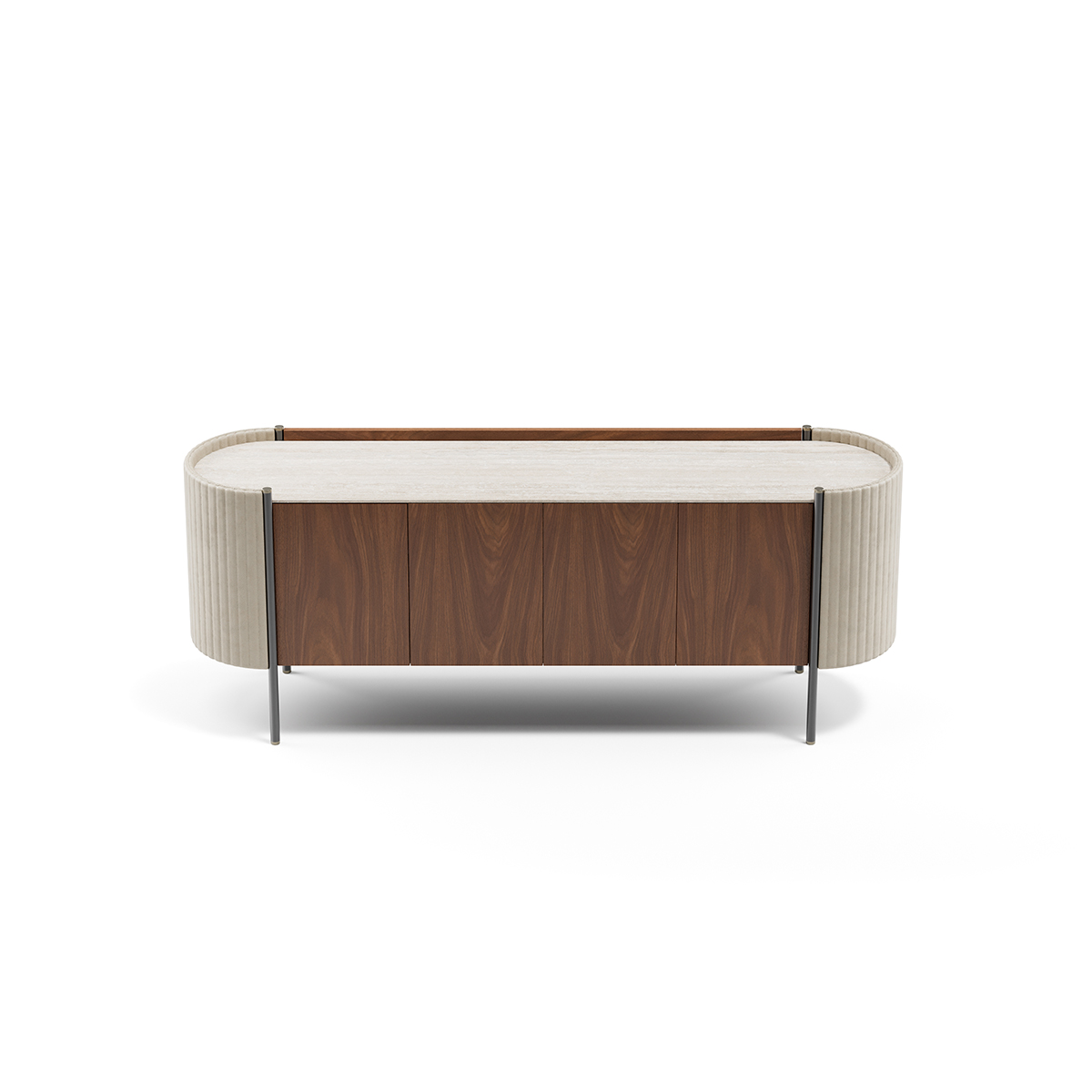 The structure is defined by its top surface, offered in marble, wood essence, or lacquered finishes. Each option shifts the character of the Karin 228, from more formal in stone to understated in wood or lacquer. Metal legs lift the body off the floor, and metallic finish details add a precise, tailored edge.