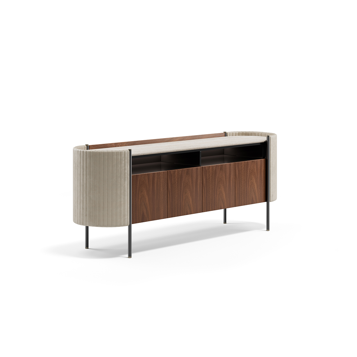 This Capital sideboard moves smoothly between roles. In a dining room, it holds porcelain and linens. In a living area, it hides devices and cables for a cleaner view, while the open compartment can host a speaker or a few favorite volumes. It also works well in a wide hallway or office, where a long, continuous top helps keep things orderly.