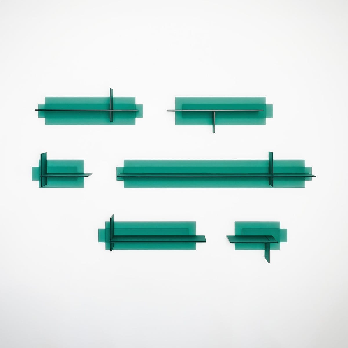 Each shelf is made entirely from special tempered glass, 0.39 inches thick, offered in green or extra-clear glass with double-sided acid-etched finish. That finish takes the edge off reflections and gives the surface a calm, soft presence while still reading as glass.