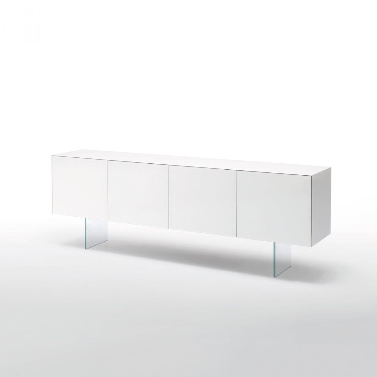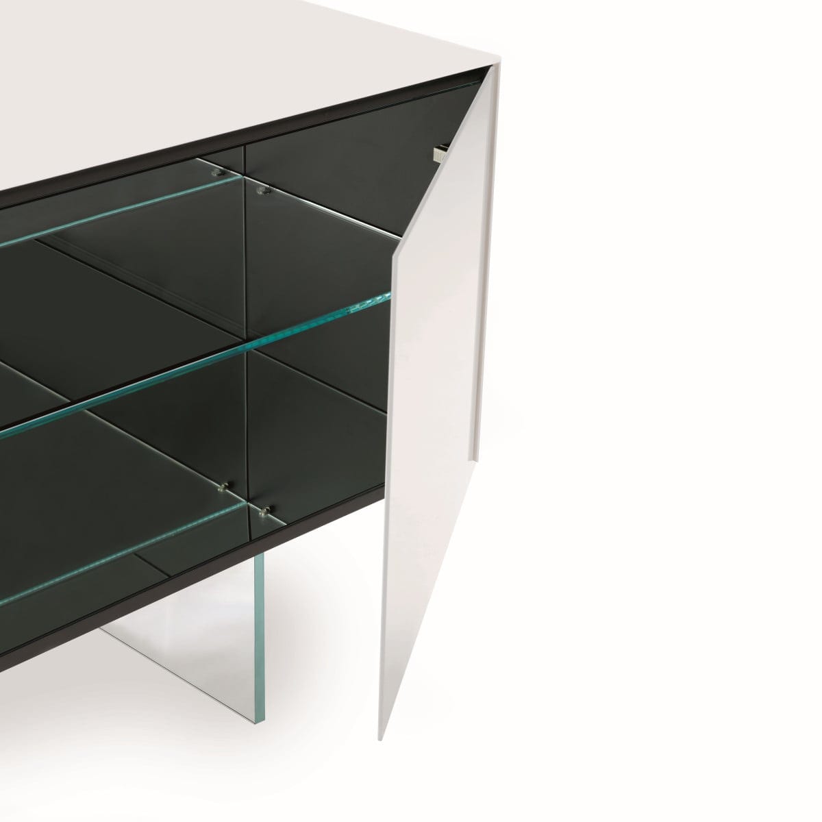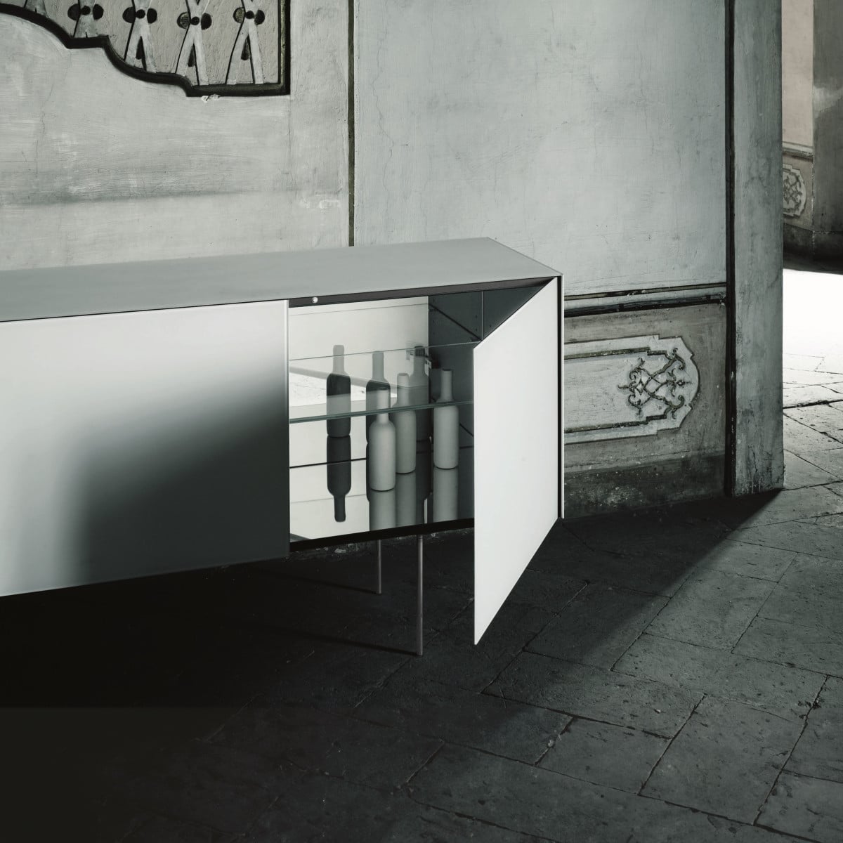 Doors close the compartments with a push-pull opening system for a handle-free front. Each door is covered in mirror on the face, keeping the look continuous when shut. Select models are supported either by a base with thin legs in glossy chromed metal or by two slabs of tempered extra-light glass, depending on the configuration.