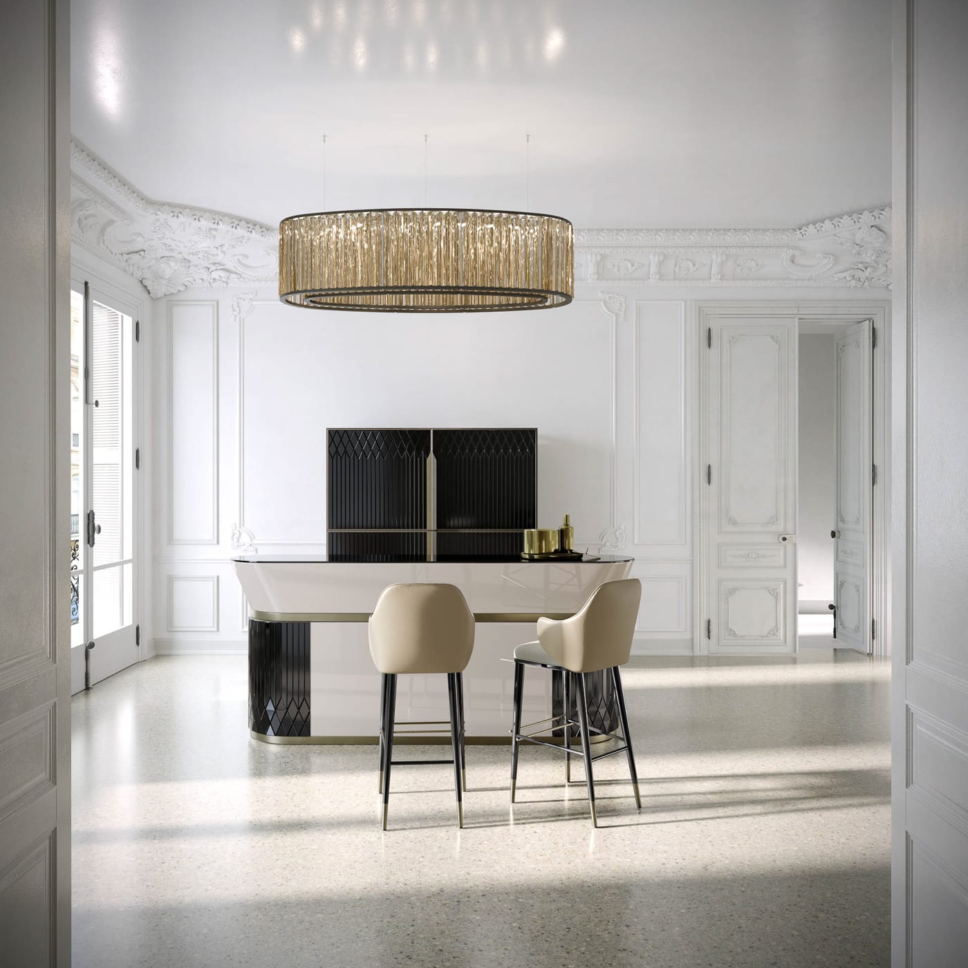In a living room, dining room, or private suite, the Prisma Bar from Capital works as both storage and a quiet focal point. The lacquered version sits well with softer furnishings, while the full marble option pairs naturally with stone floors or more architectural interiors.