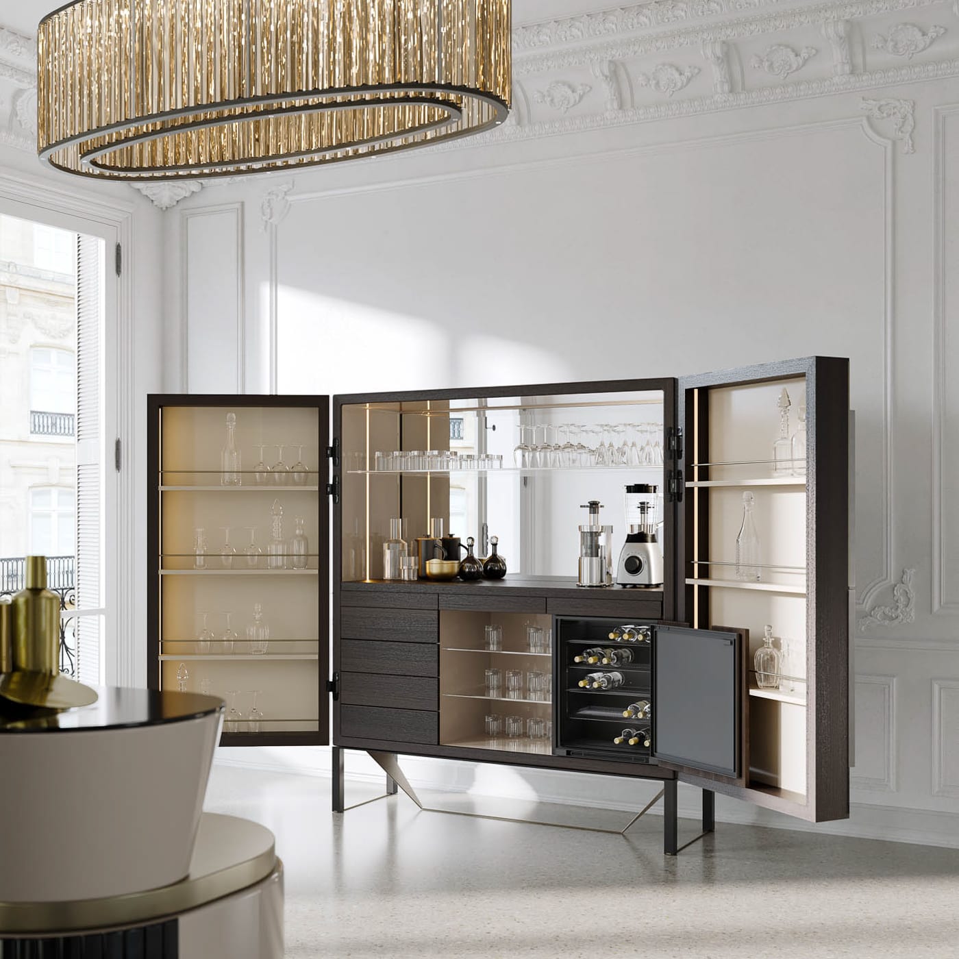 It suits homes that entertain, but also private offices or hospitality suites where a composed bar corner is needed. Closed, it reads as a refined cabinet. Open, it shifts the atmosphere immediately into hosting mode.