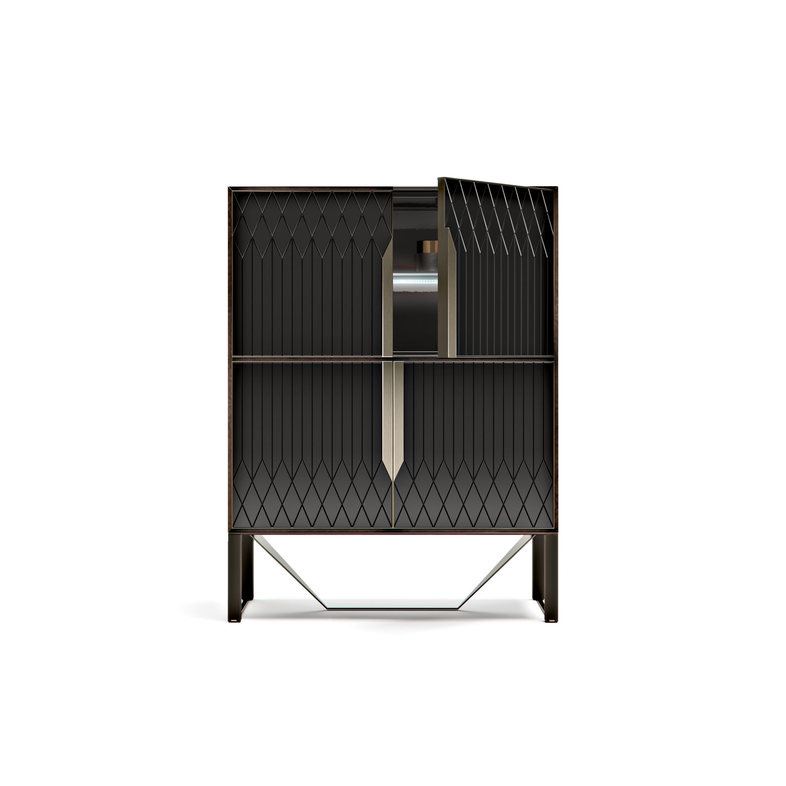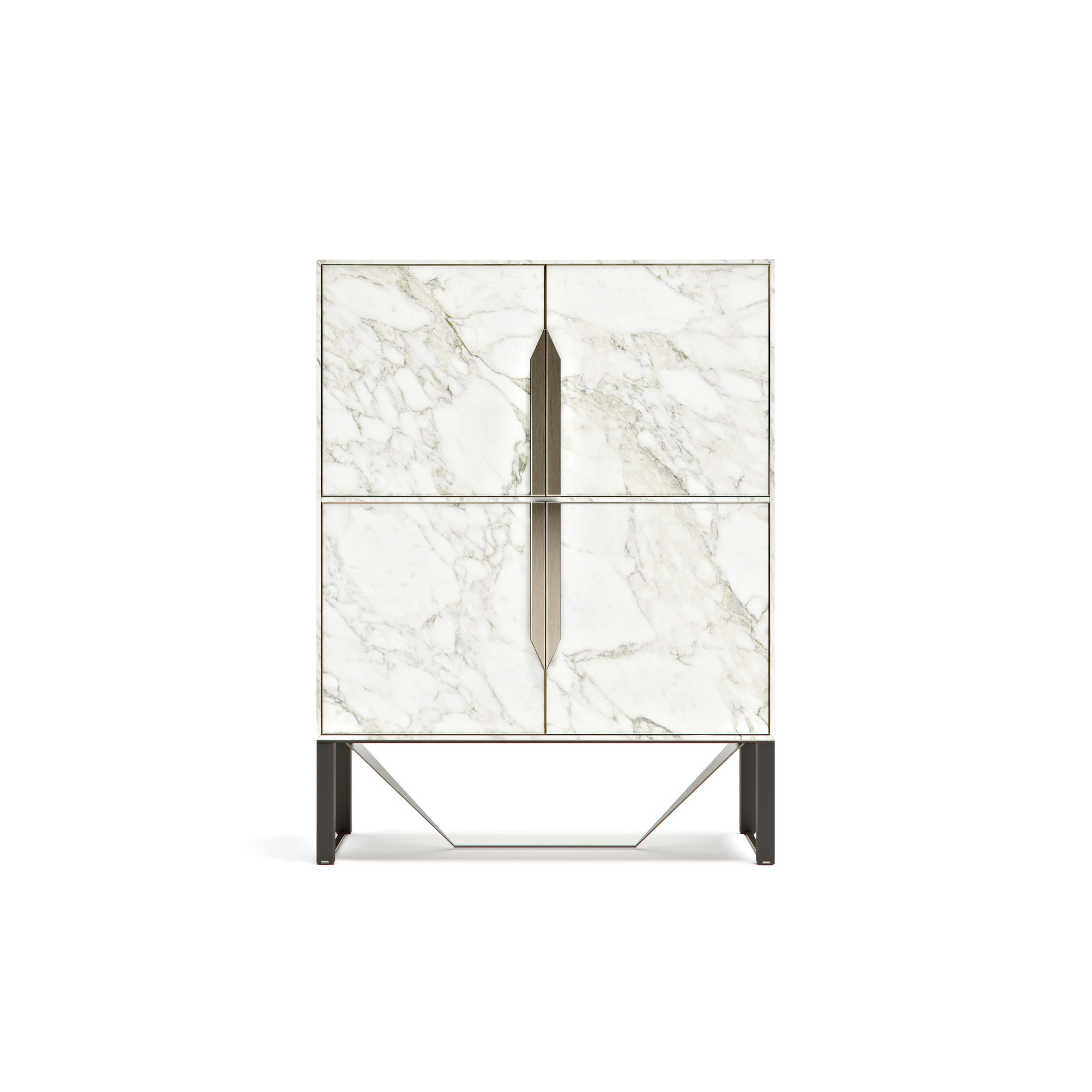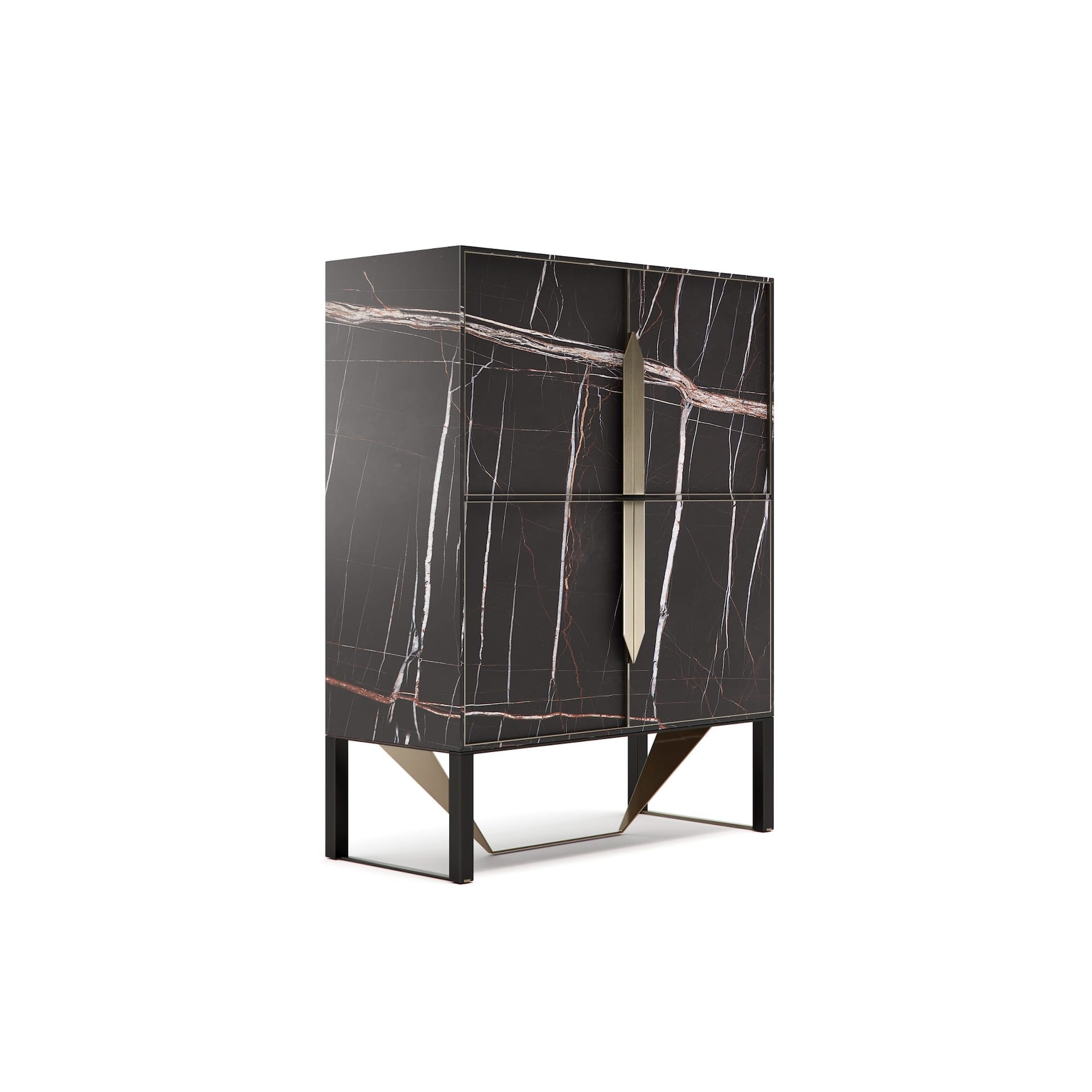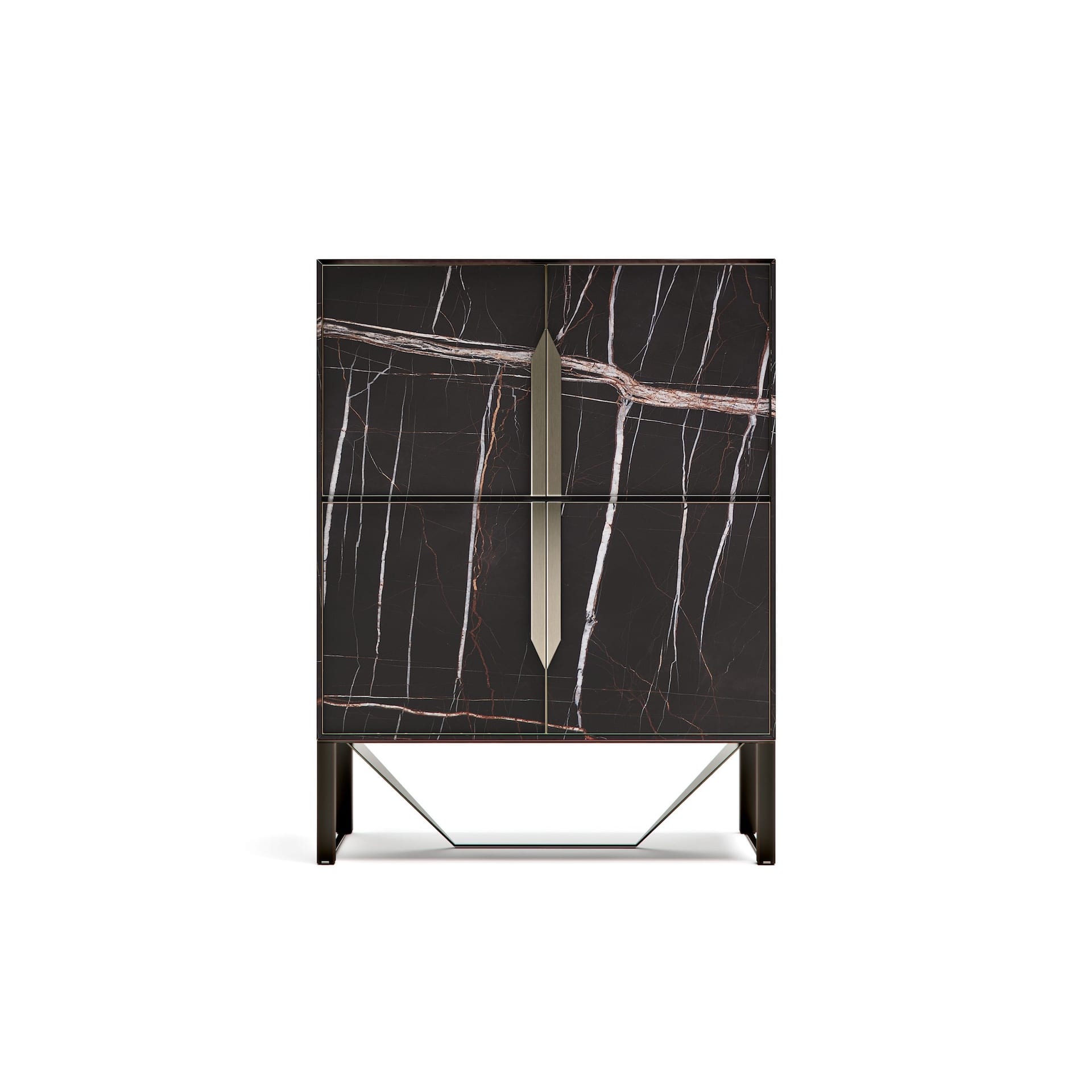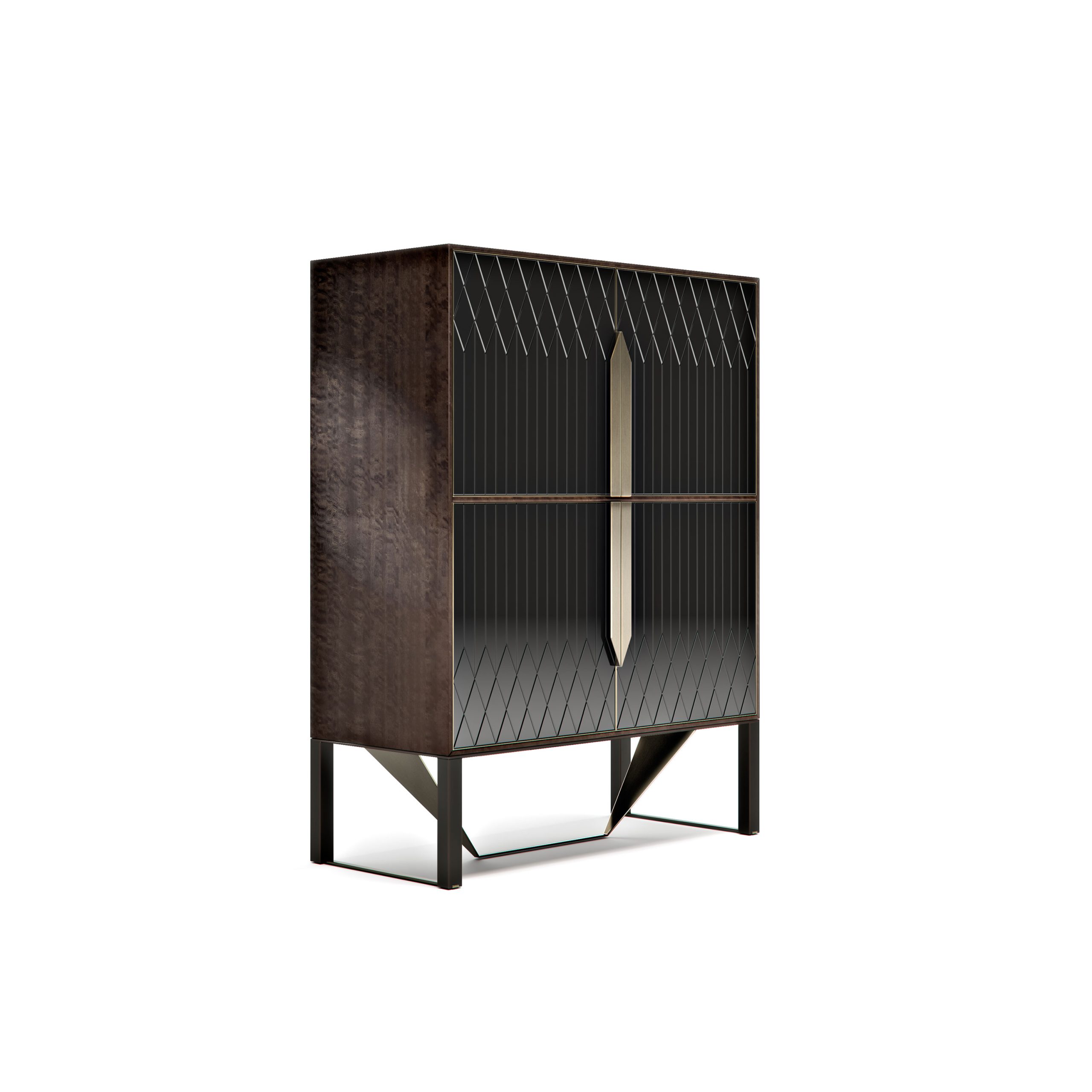 Natural wood and marble are the key players here, supported by carefully chosen metals. The cabinet can be specified with lacquered doors that show off the pattern of the fronts, or fully clad in marble for a more monolithic, sculpted look. Inside, a glass shelf spans the width, keeping the interior visually light while offering a practical surface for display or storage.