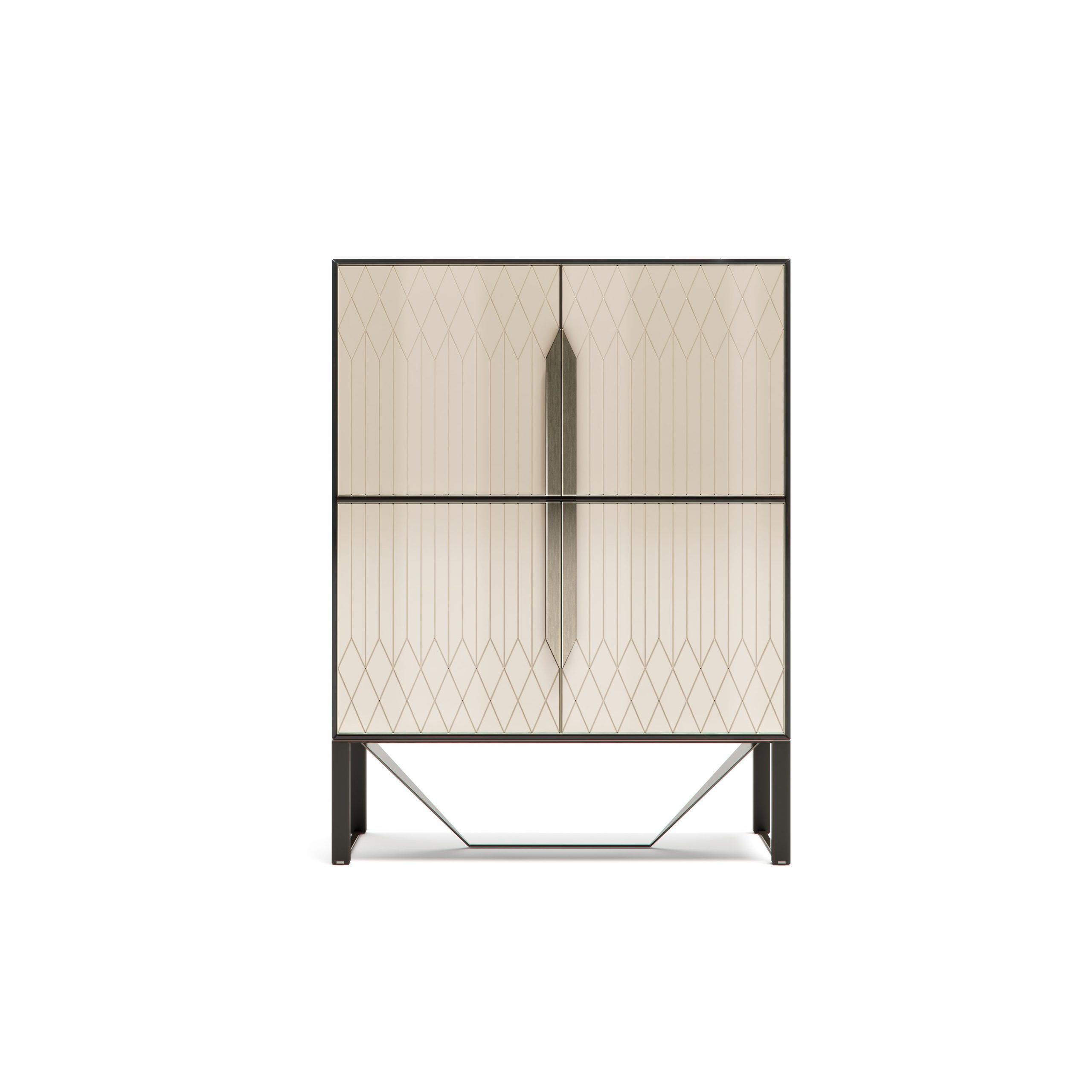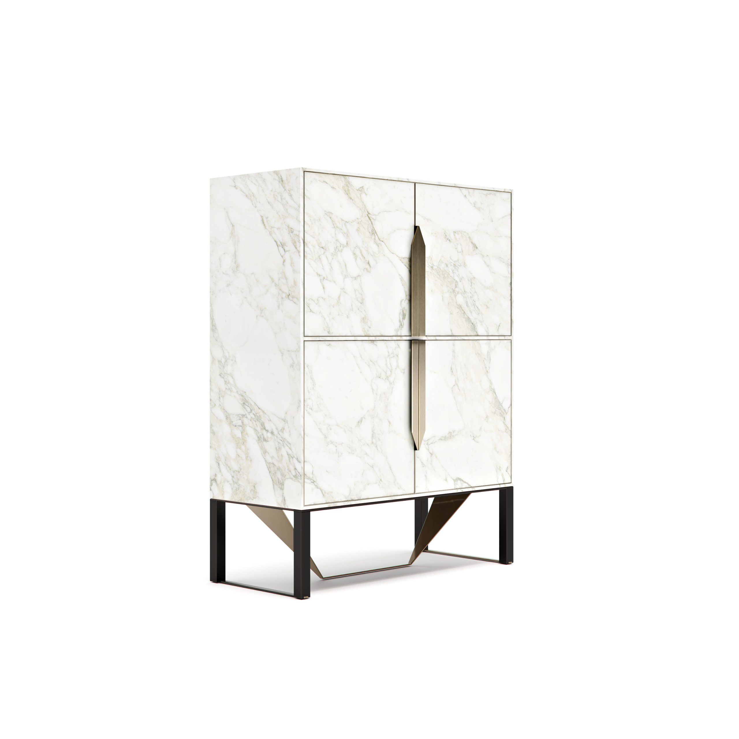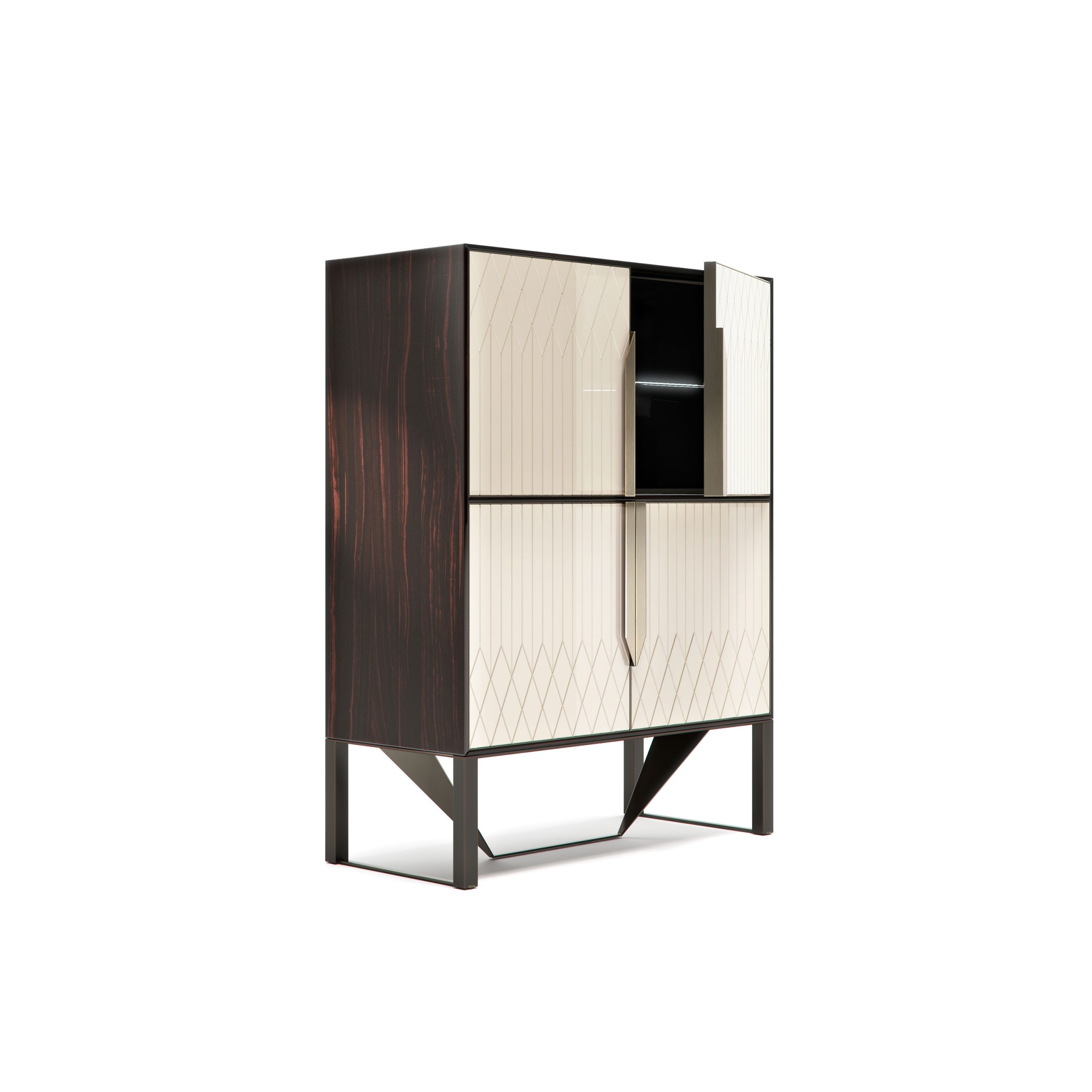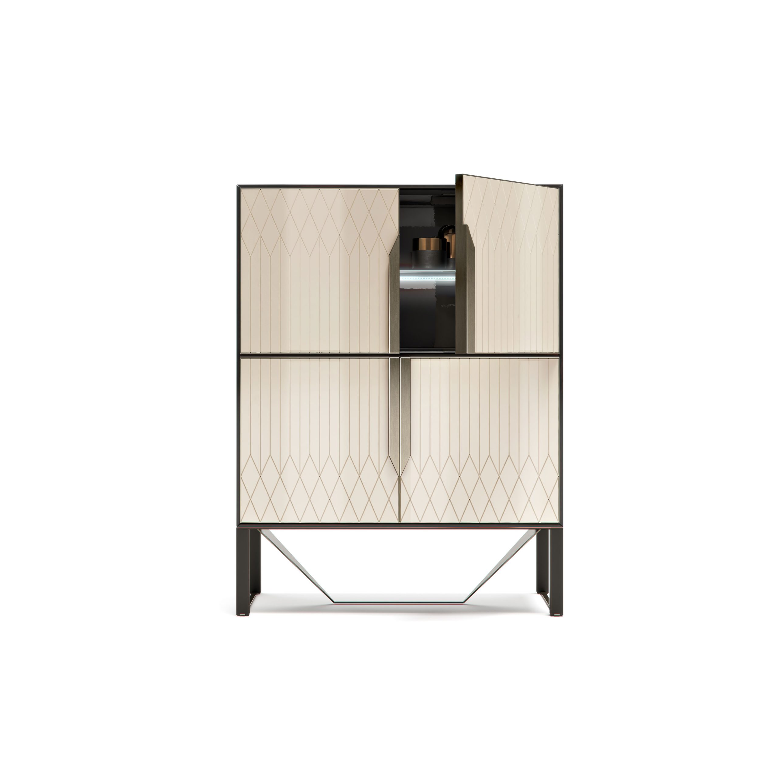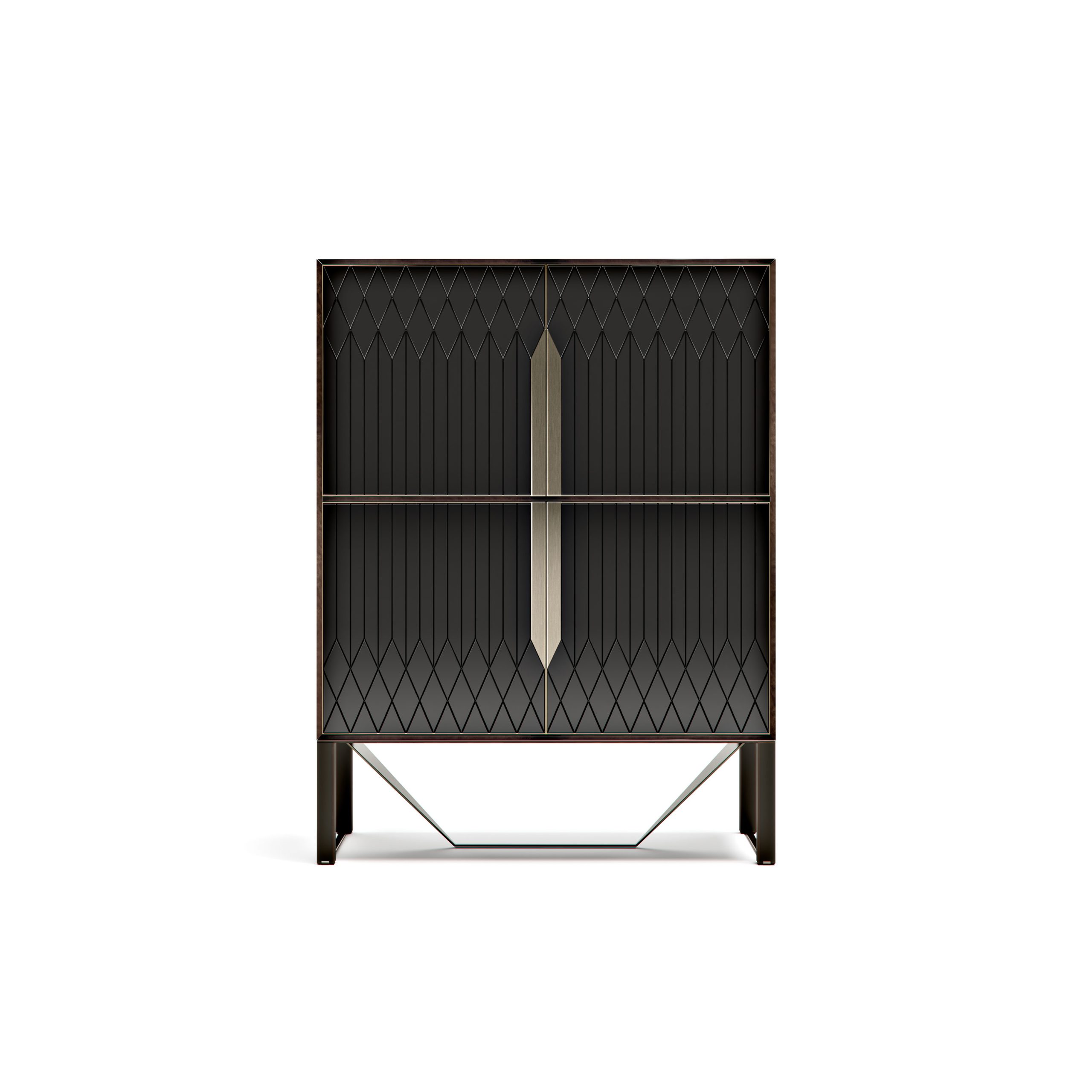 Natural wood and marble are the key players here, supported by carefully chosen metals. The cabinet can be specified with lacquered doors that show off the pattern of the fronts, or fully clad in marble for a more monolithic, sculpted look. Inside, a glass shelf spans the width, keeping the interior visually light while offering a practical surface for display or storage.