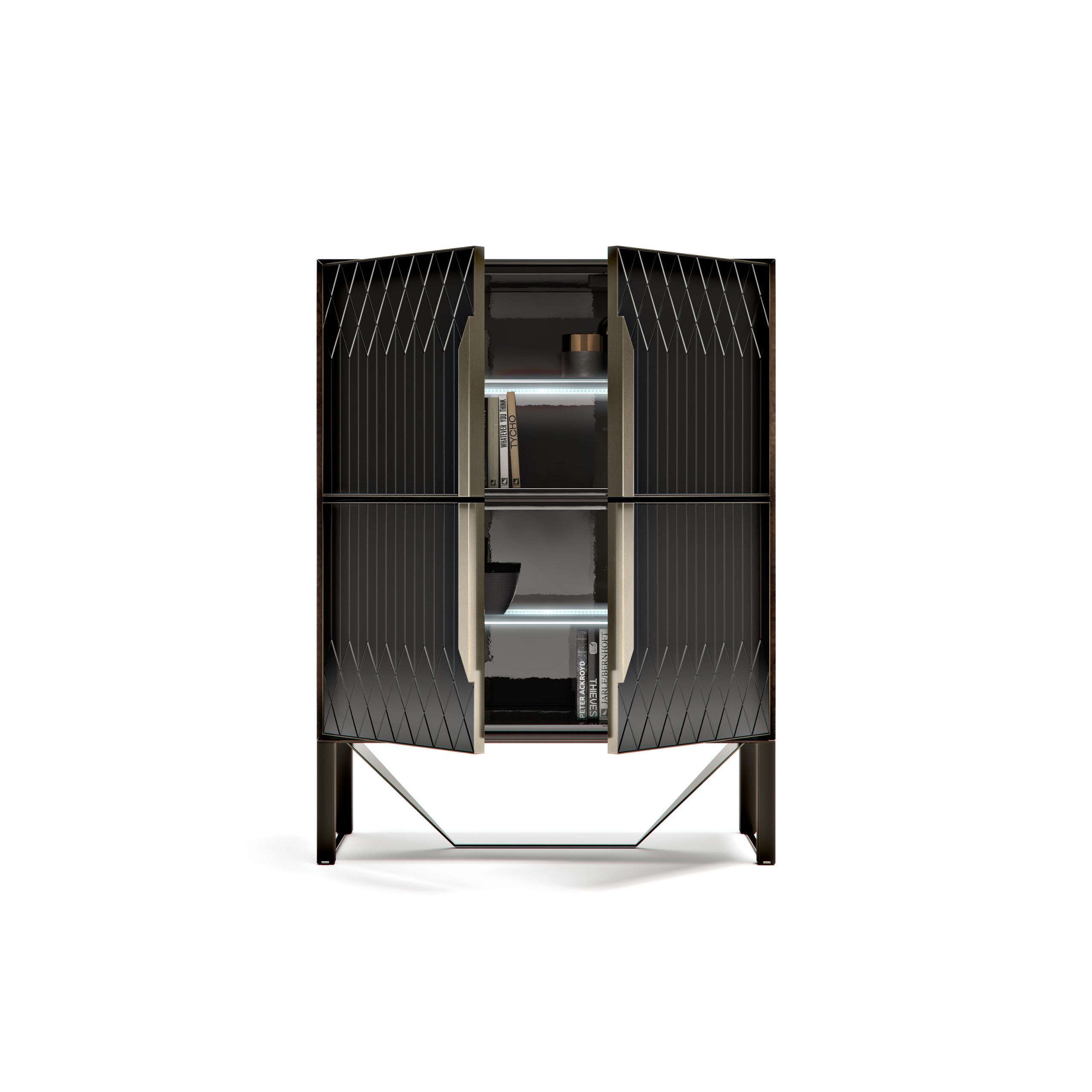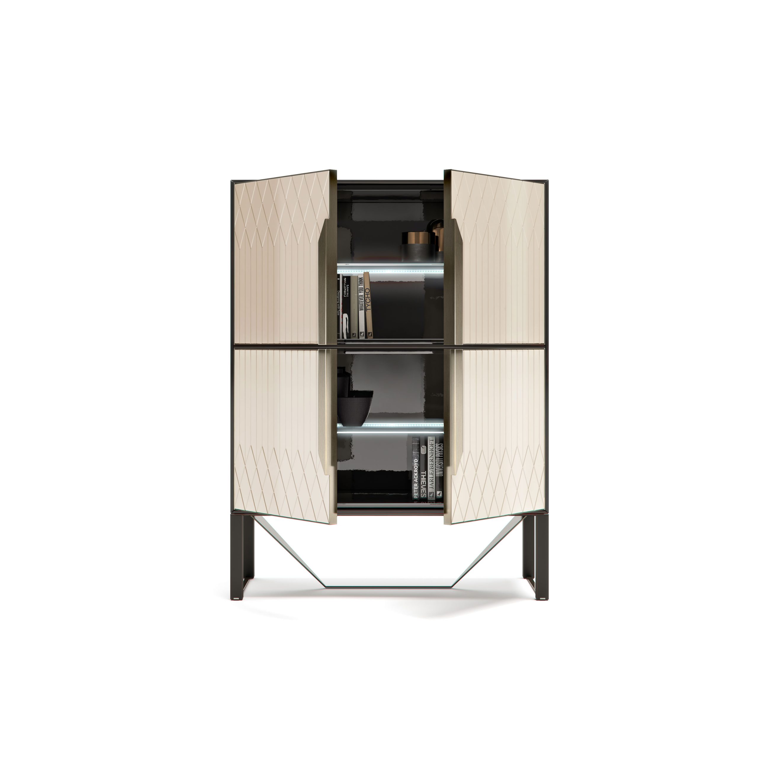 Although it reads as a statement piece, Prisma is straightforward to live with. Four hinged doors open wide, so contents are easy to reach without awkward stretching or searching. The glossy black interior helps objects stand out rather than disappear into shadows.