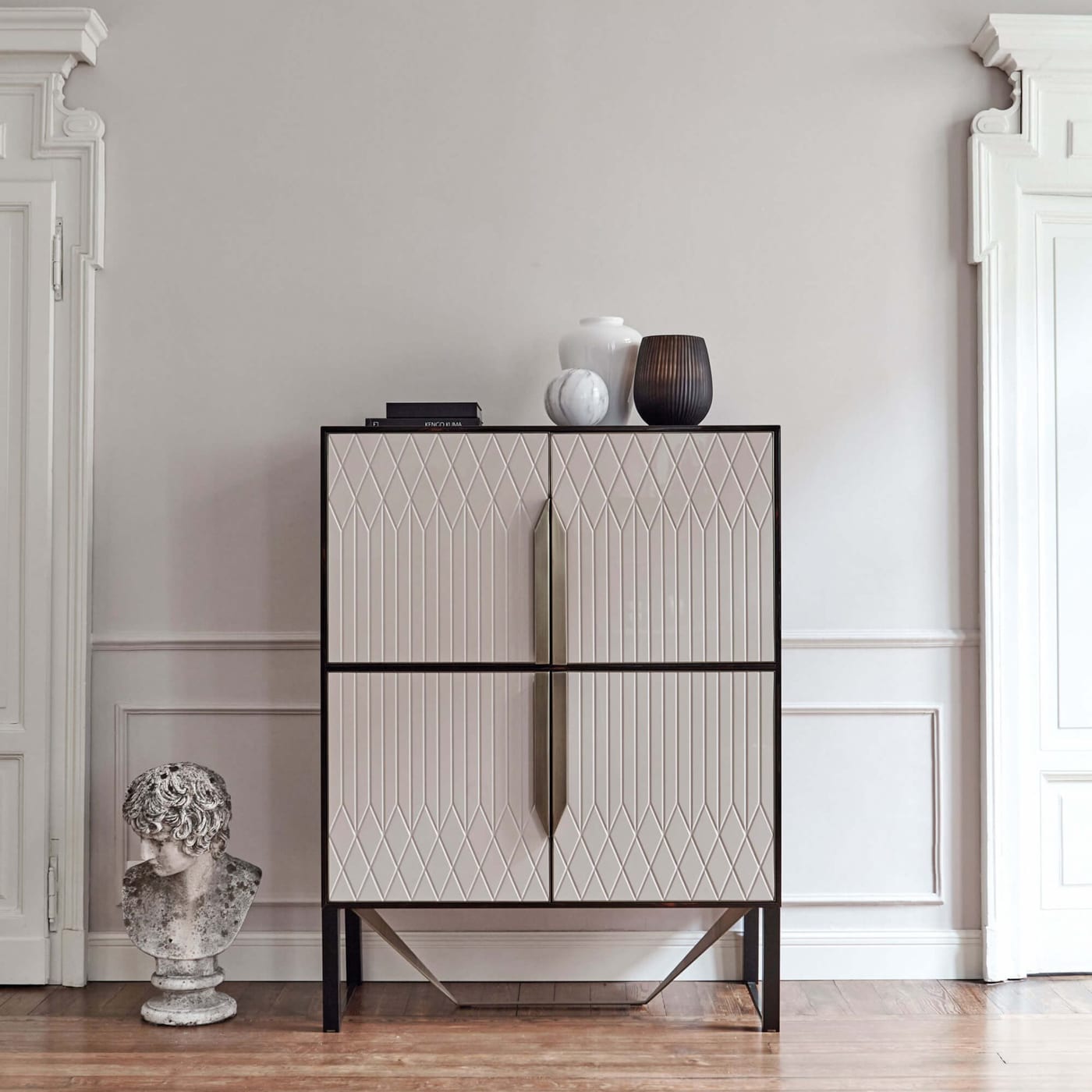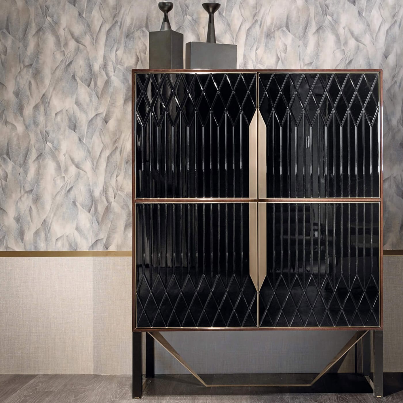 The Prisma cabinet from Capital carries a calm, confident presence. Designed by Boatto Martino Studio for the 2016 Cabinets collection, it relies on strong geometry and clean planes rather than ornament. Four hinged doors form a precise, patterned front, whether finished in lacquer or wrapped entirely in marble. Open it, and the contrast appears: a glossy black interior that frames what is stored inside and catches the light in a subtle, controlled way.