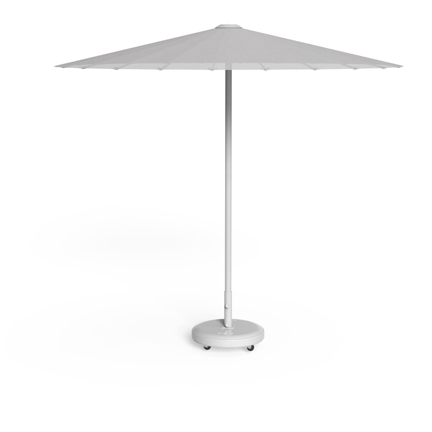 This parasol adapts to different settings with ease. On a city terrace, the graphite combinations pair well with concrete, steel, and dark woods. By the pool or on a bright patio, white—with blue or red accents—brings freshness and clarity. In a garden, dove keeps the tone soft and natural. One can stand alone as a focal point, or a line of them can define a lounge path or row of daybeds. It blends naturally with modern outdoor seating and dining pieces from the Talenti Parasol collection and beyond.